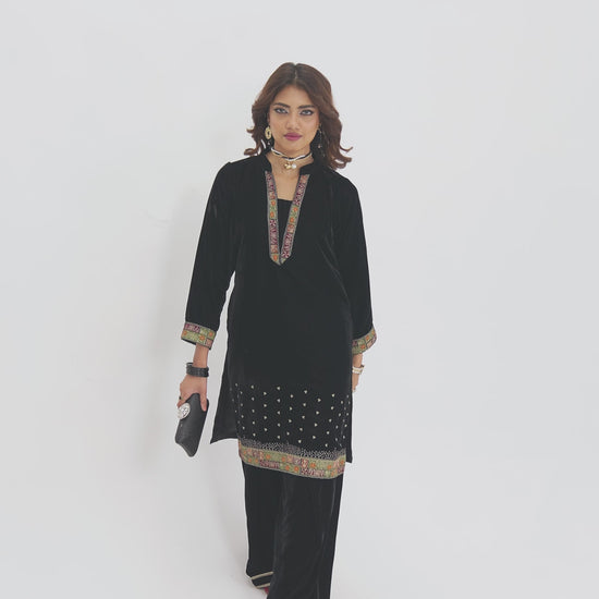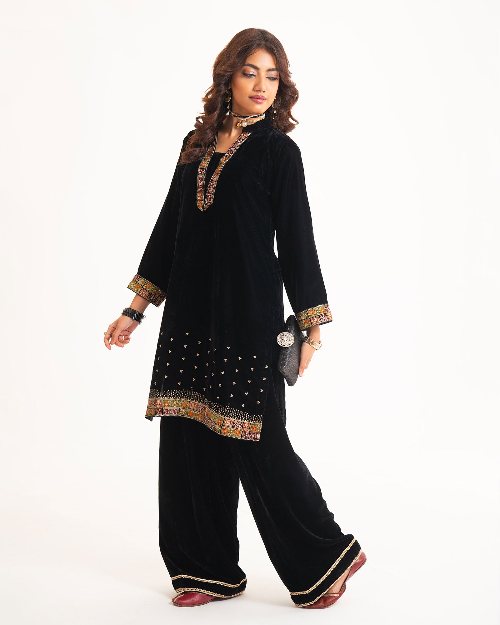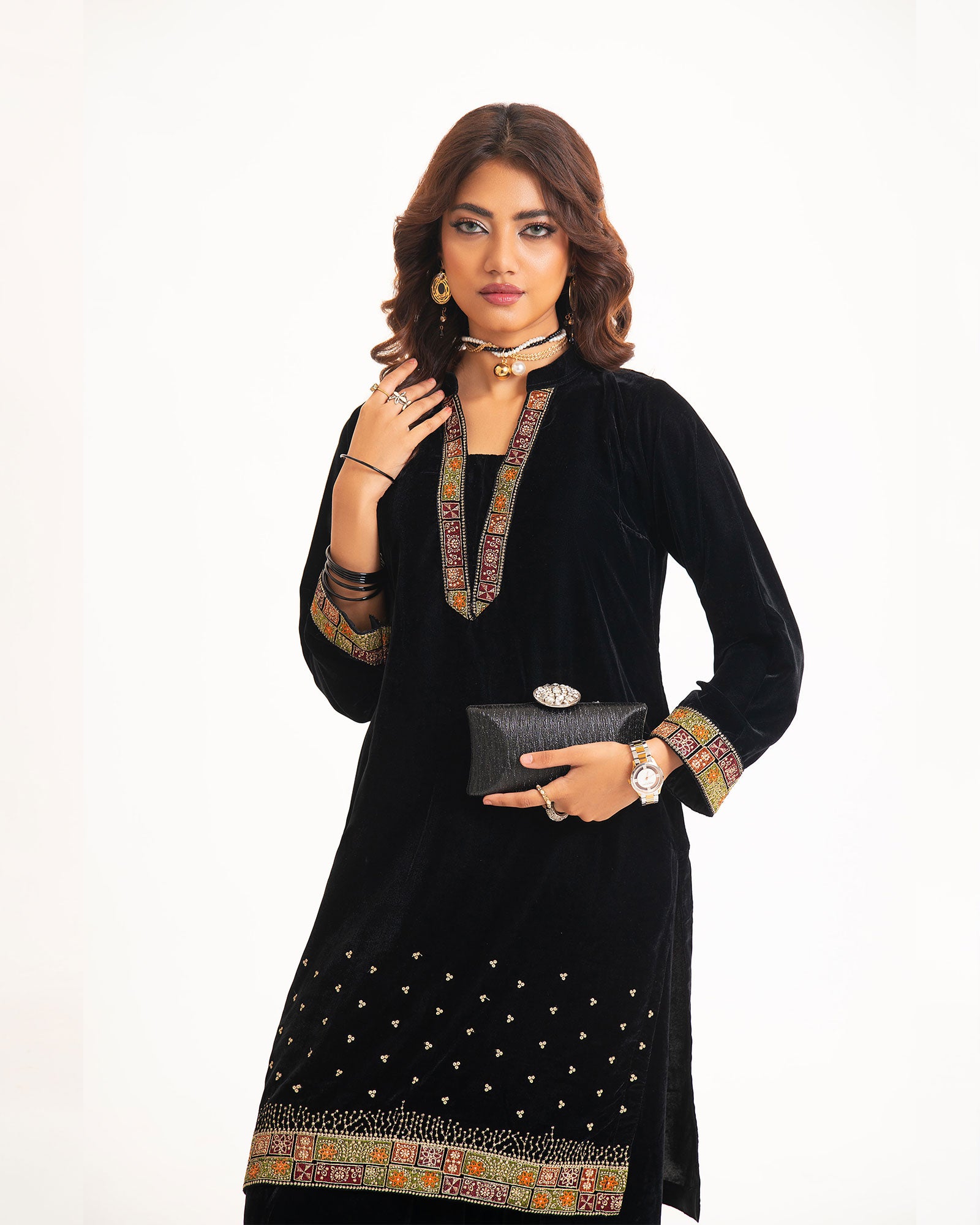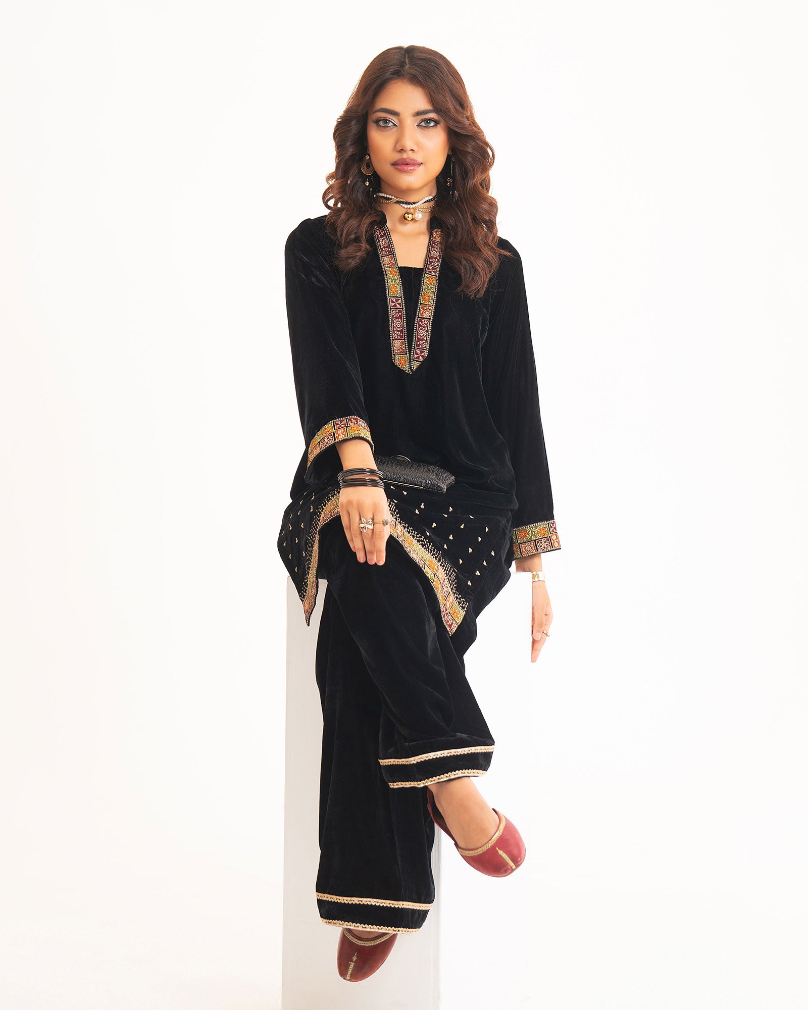 A black velvet embroidered kurta paired with a farshi shalwar exudes winter elegance with effortless charm. Rich textures and a classic silhouette elevate this casual look into timeless, graceful beauty.