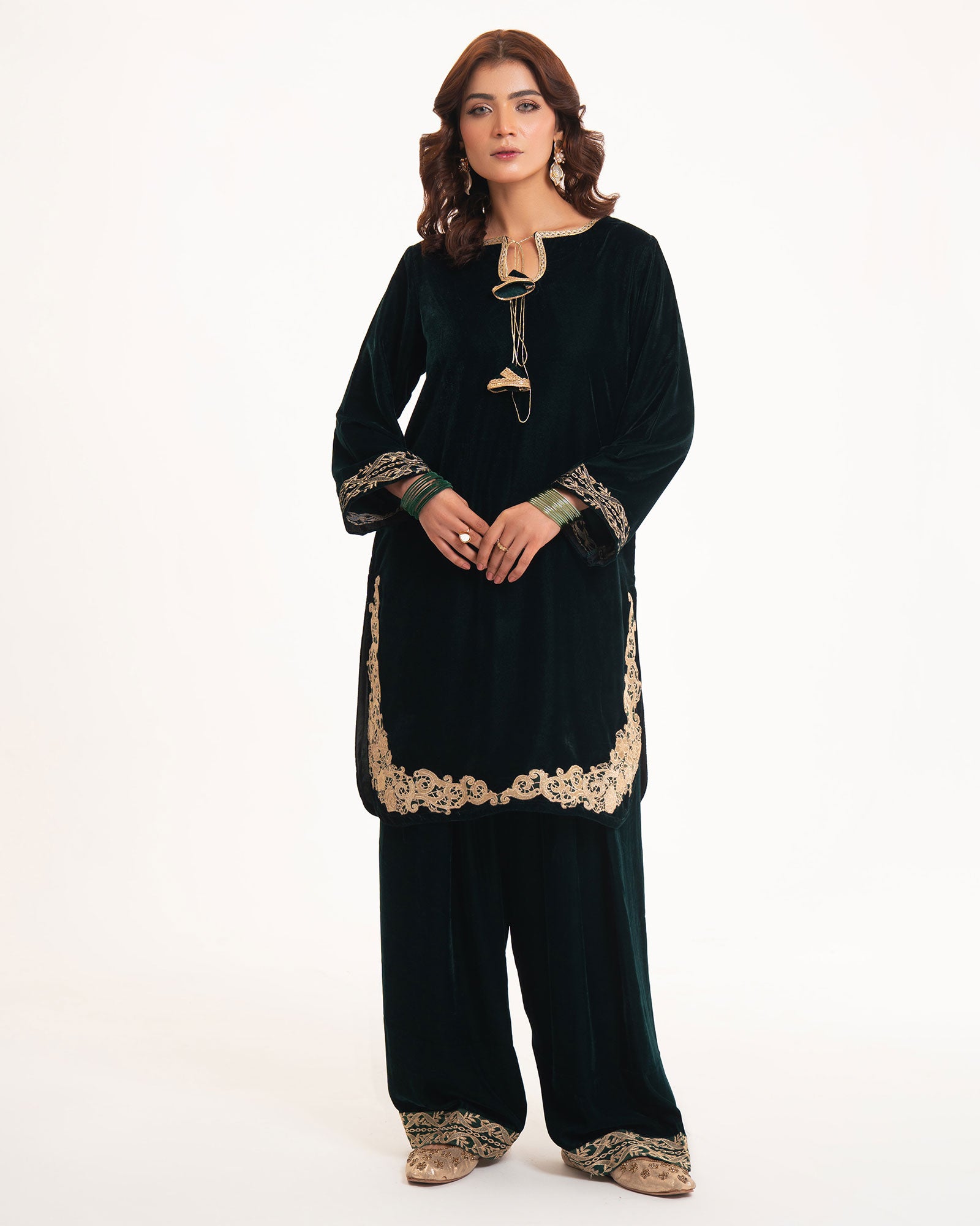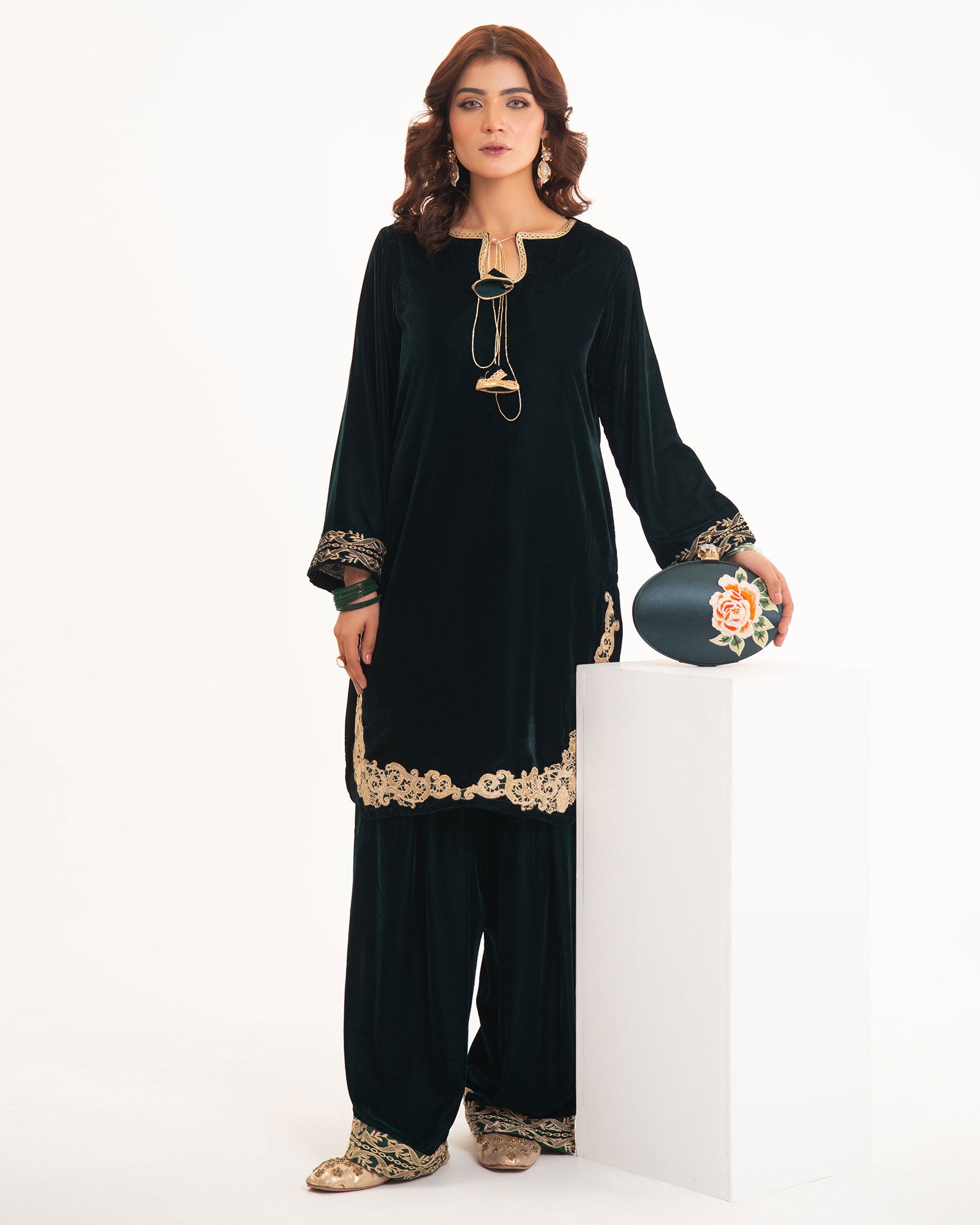 Wrapped in bottle-green velvet, this round-daman kurta with embroidery paired with a farshi shalwar captures winter charm with effortless beauty. The rich hue and classic silhouette blend comfort with timeless style. A casual look elevated to pure elegance graceful, warm, and absolutely gorgeous.