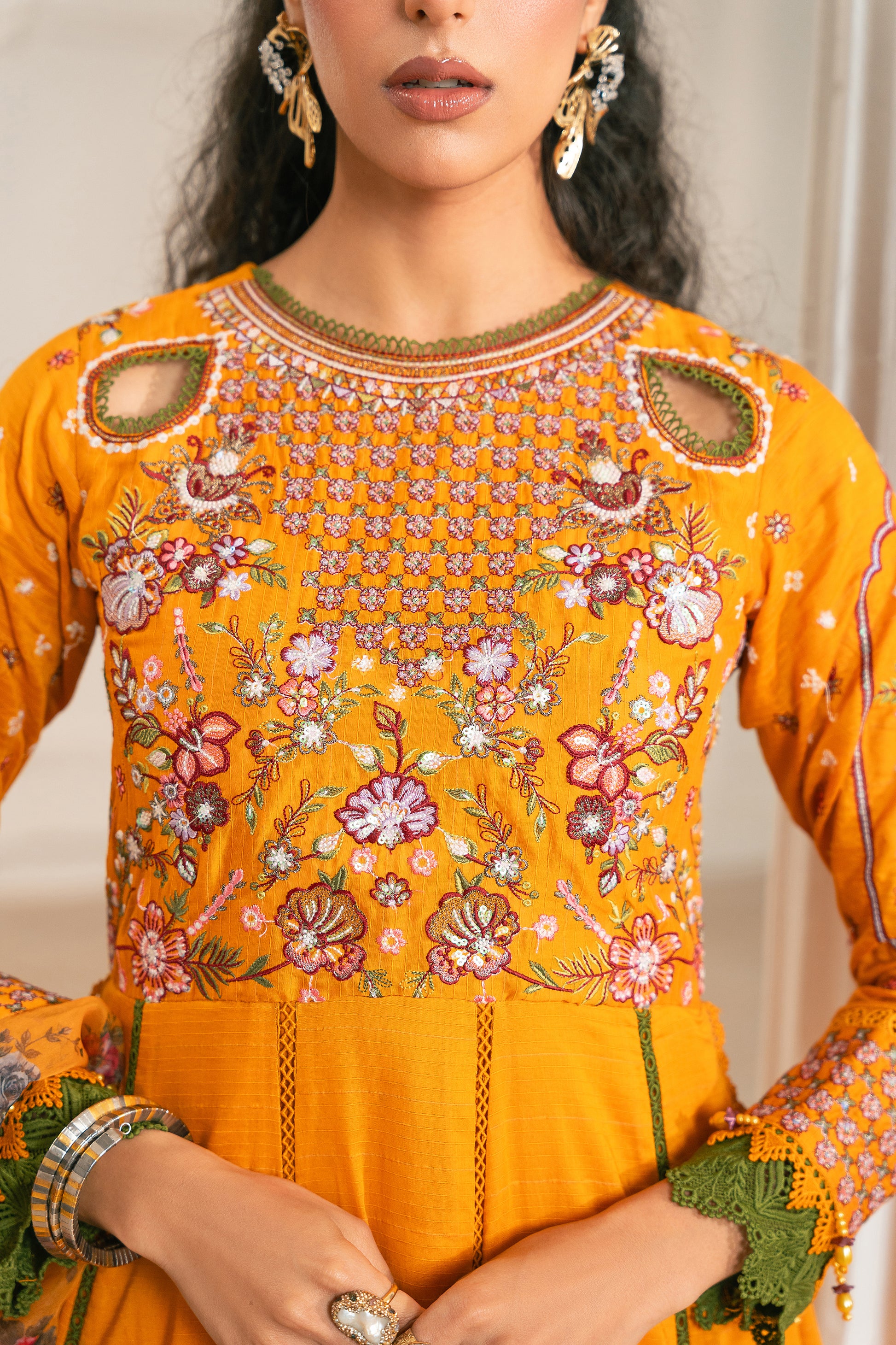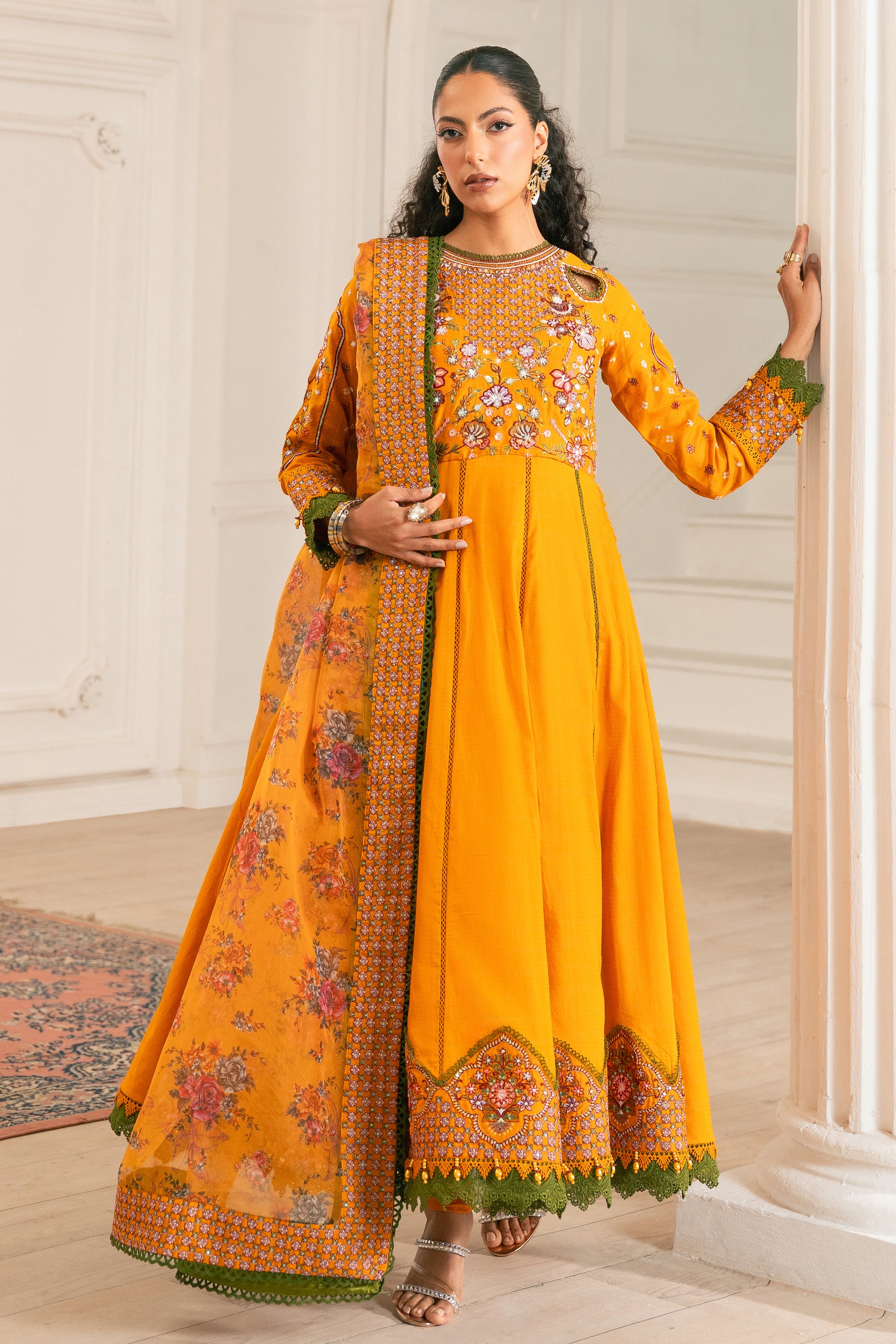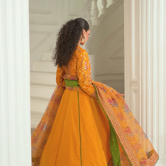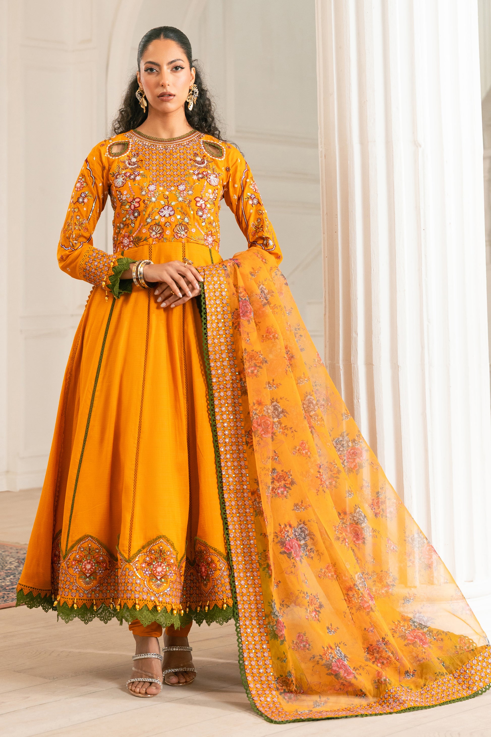 Adorned with our signature cutout delicate embroidery, this vibrant yellow outfit is a masterpiece. Paired with elegant ivory & multi embroidery, it exudes traditional charm. The ensemble includes a churidar pajama, accentuated with a stunning four-sided border patch, and completed with a beautifully printed organza dupatta. Perfect for Eid celebrations, this outfit embodies timeless tradition and elegance.