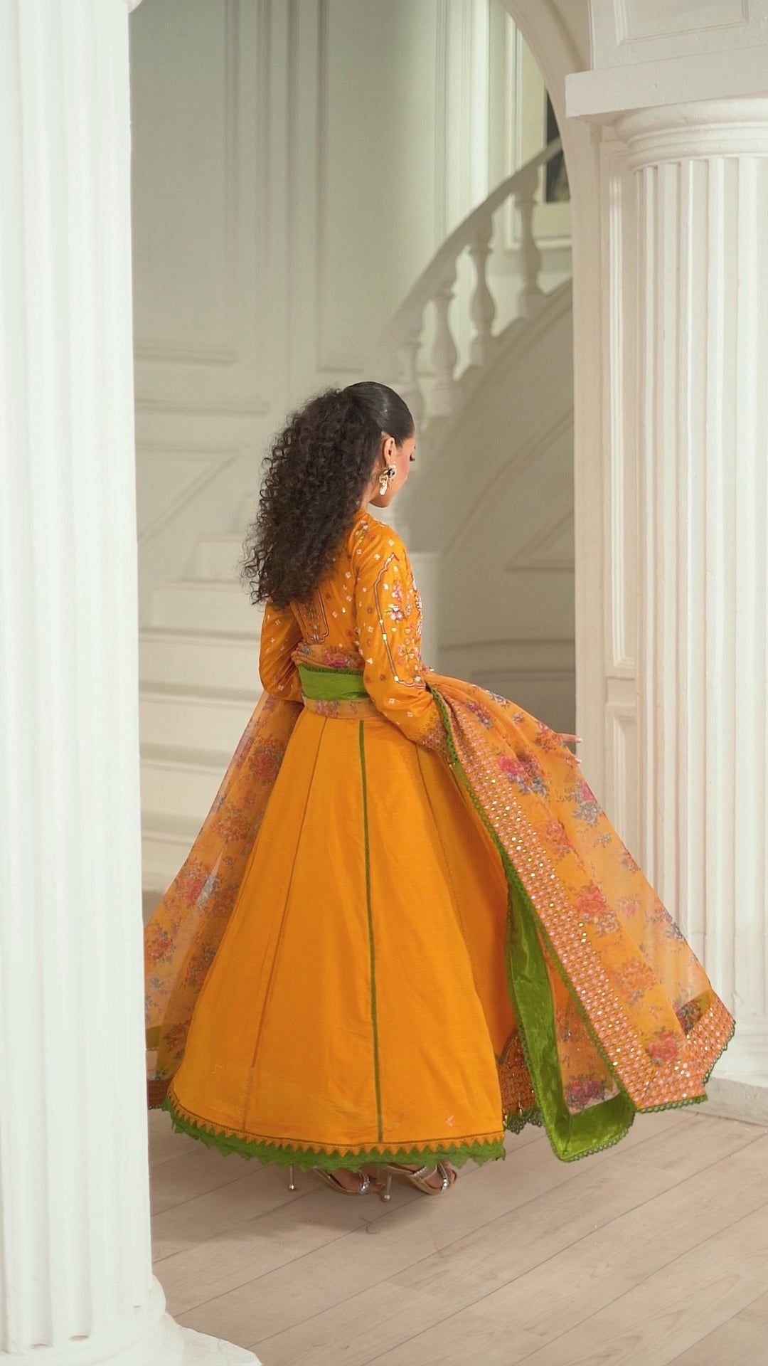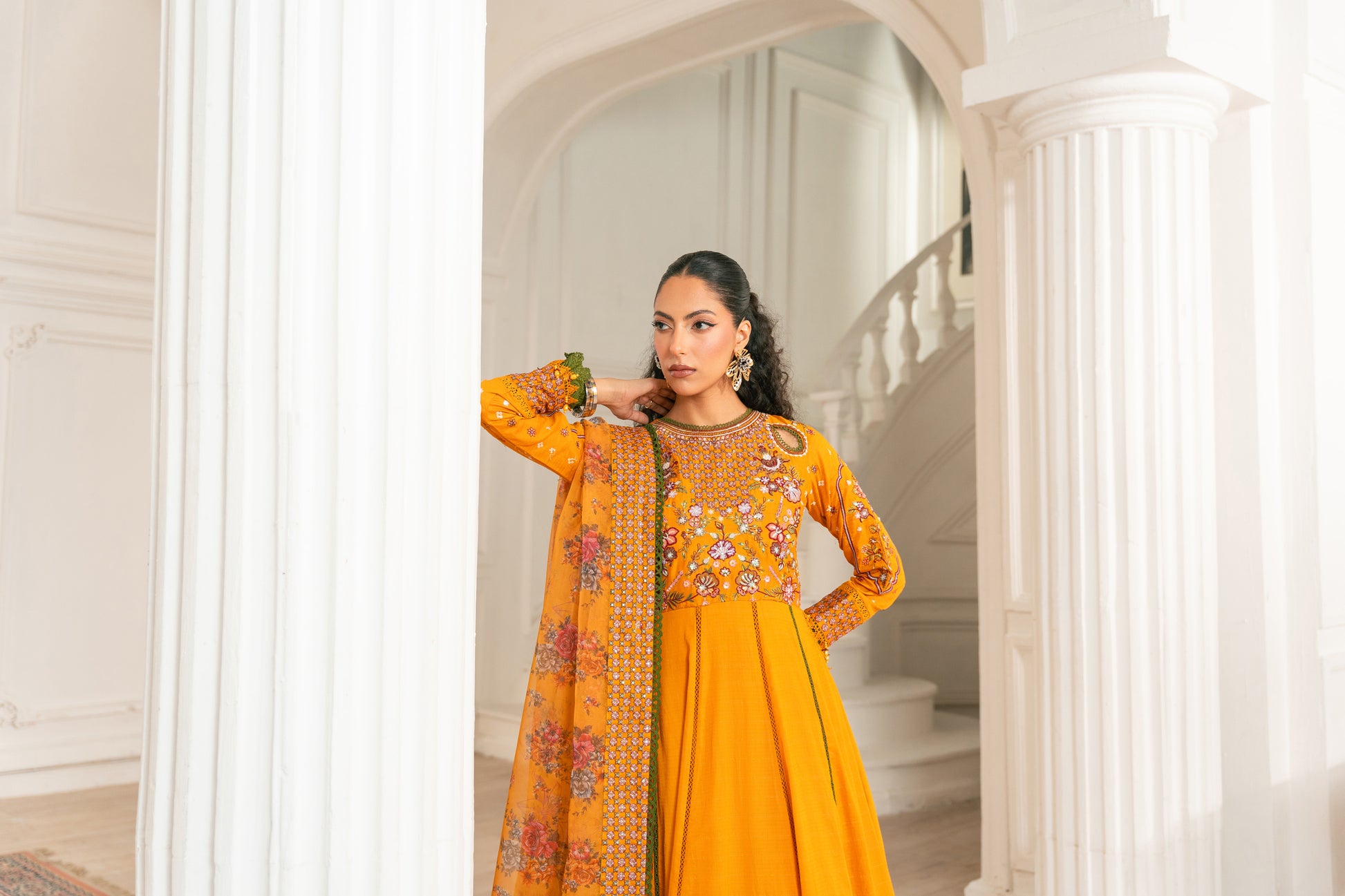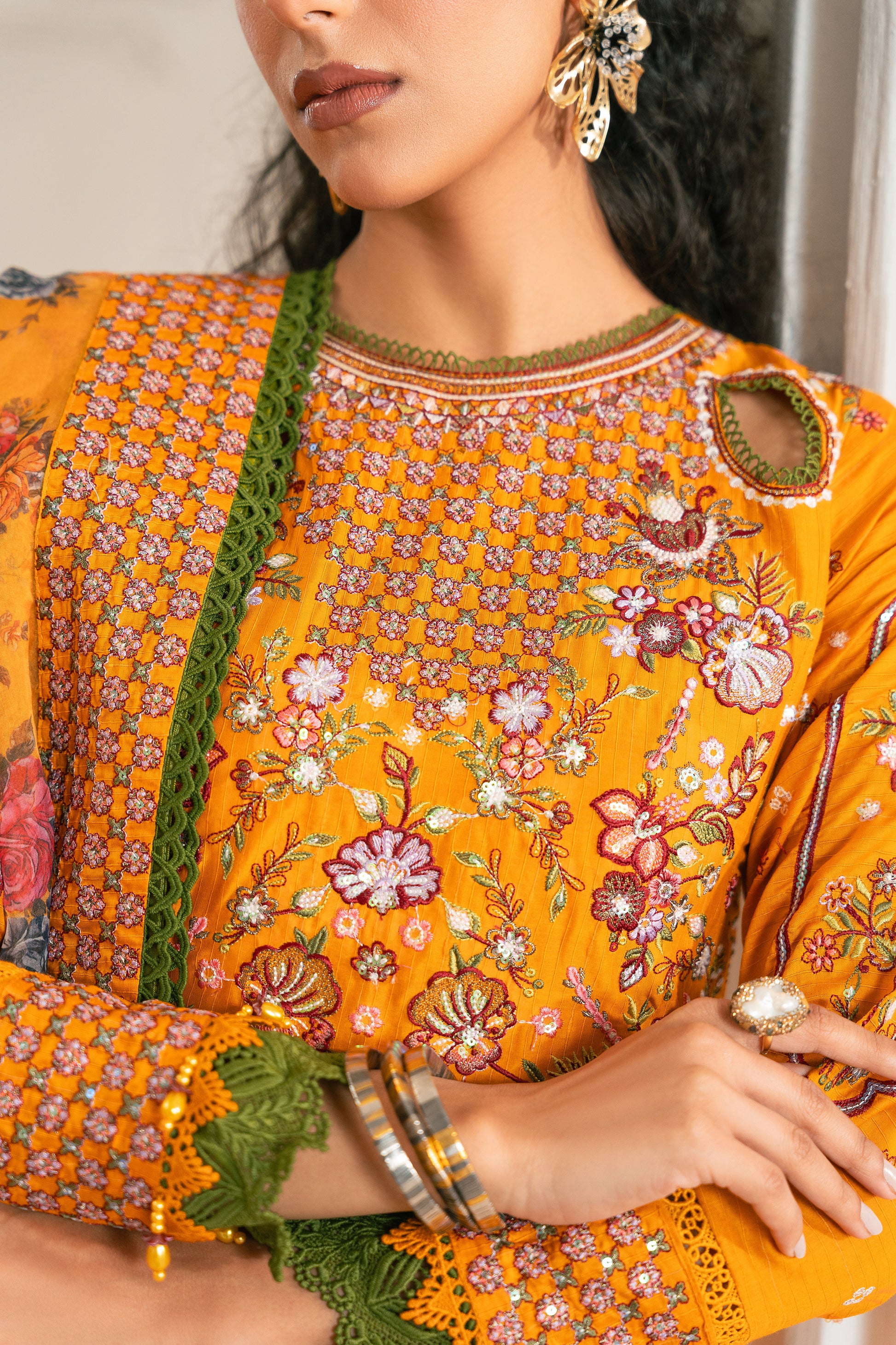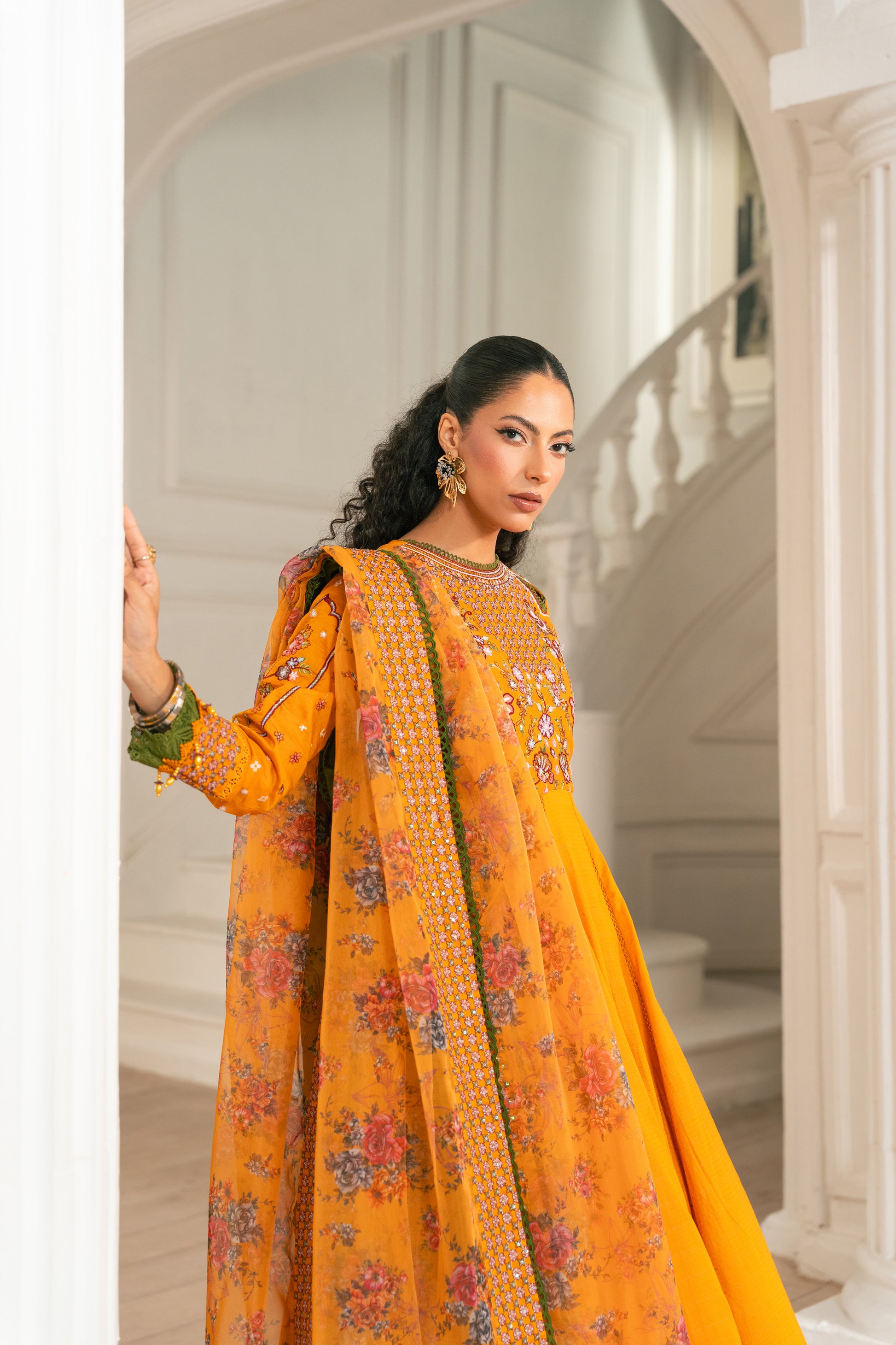 Adorned with our signature cutout delicate embroidery, this vibrant yellow outfit is a masterpiece. Paired with elegant ivory & multi embroidery, it exudes traditional charm. The ensemble includes a churidar pajama, accentuated with a stunning four-sided border patch, and completed with a beautifully printed organza dupatta. Perfect for Eid celebrations, this outfit embodies timeless tradition and elegance.