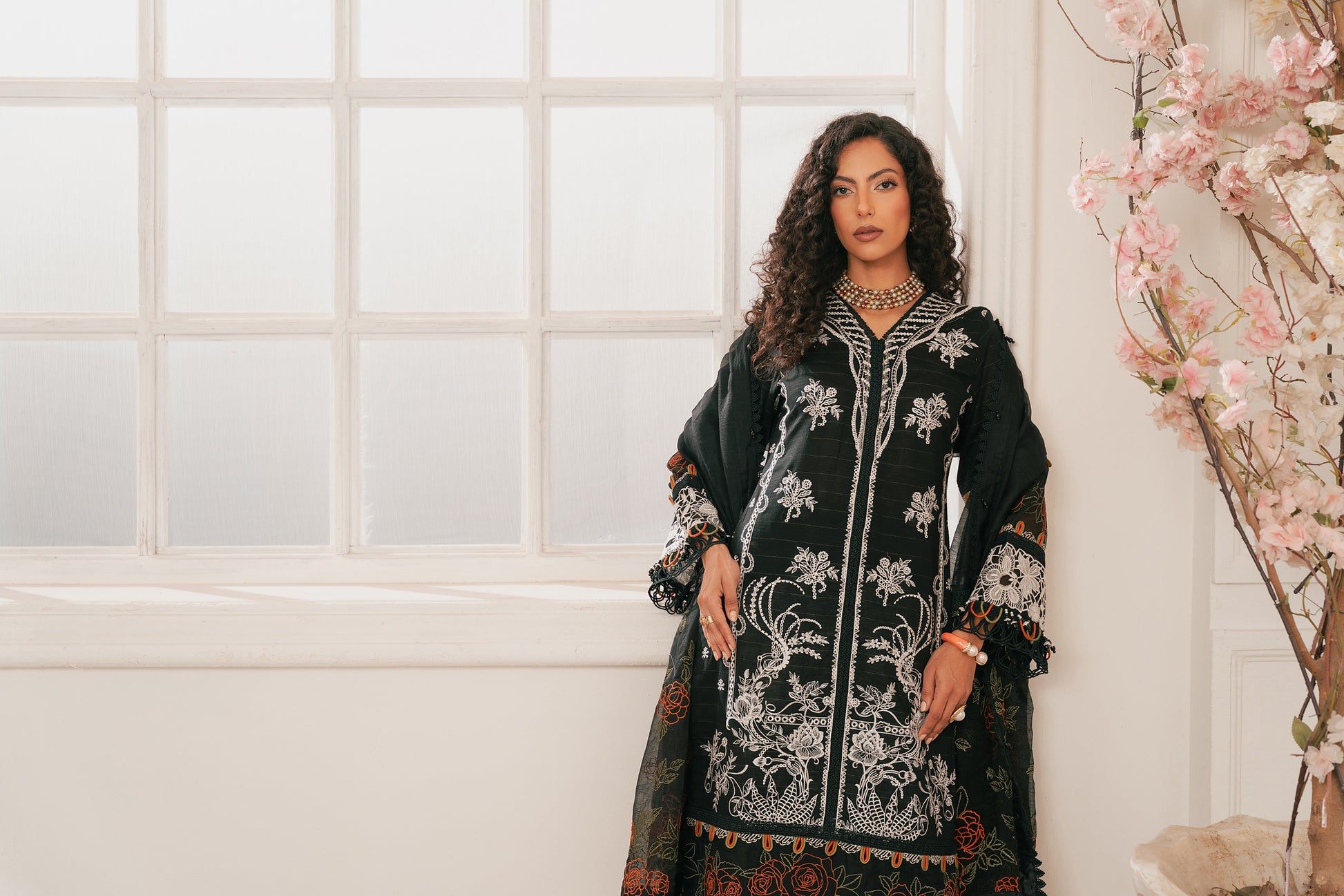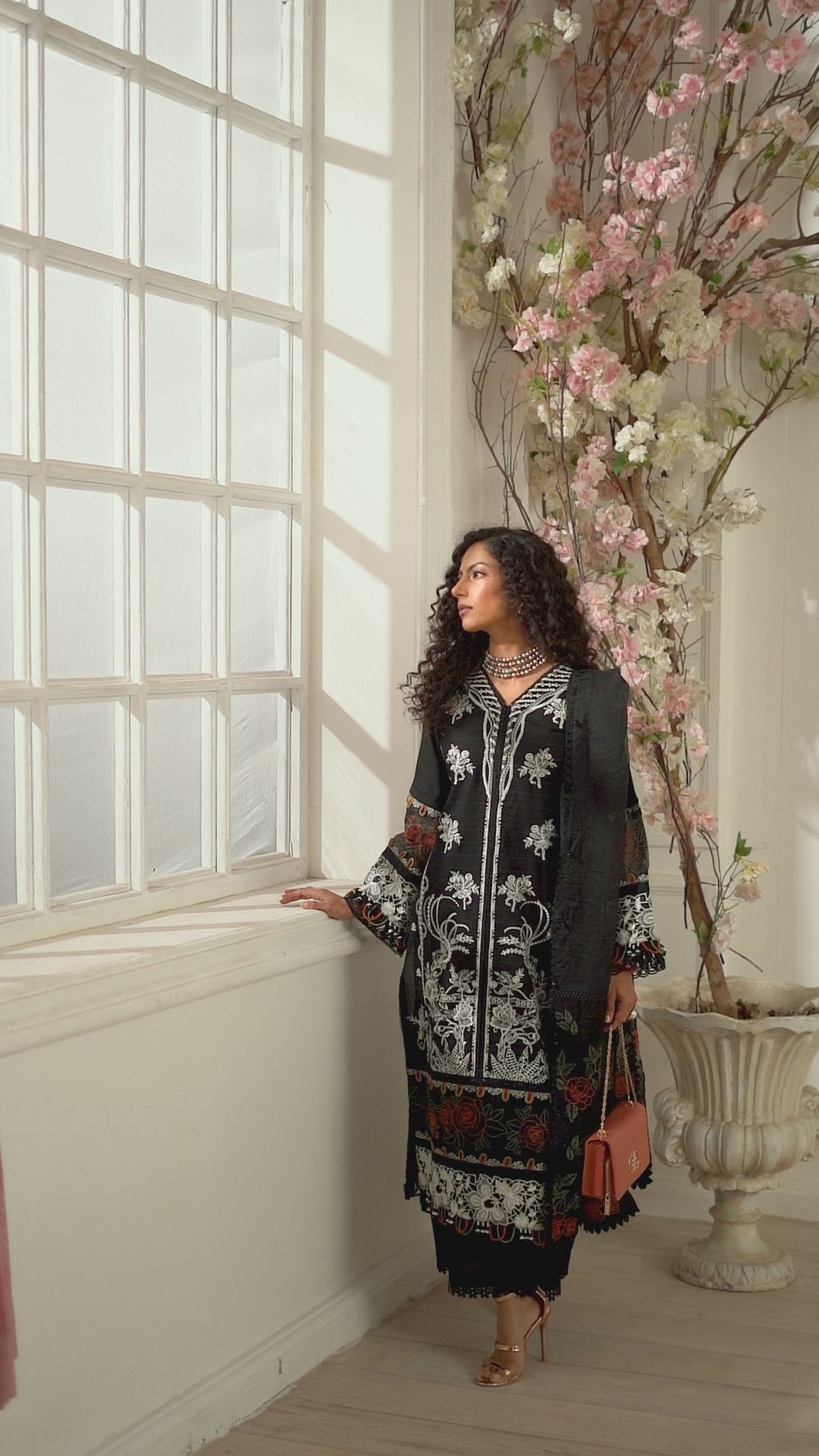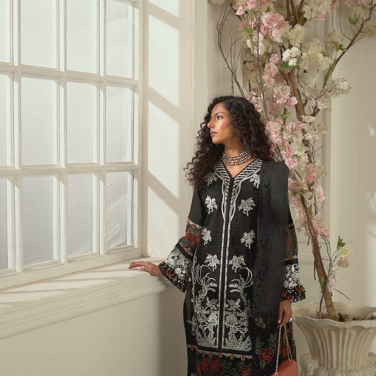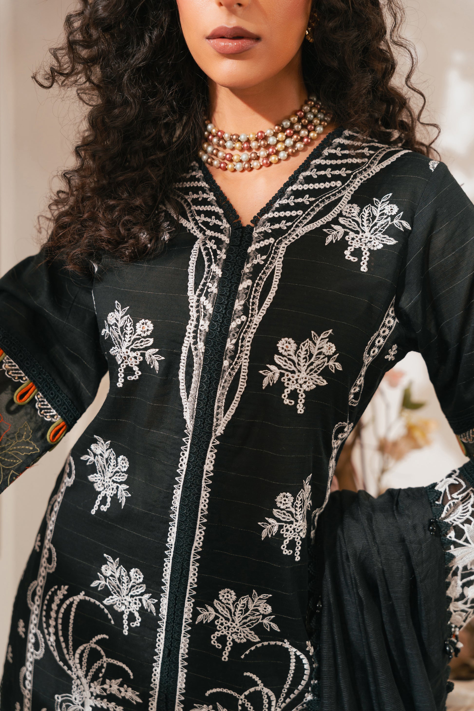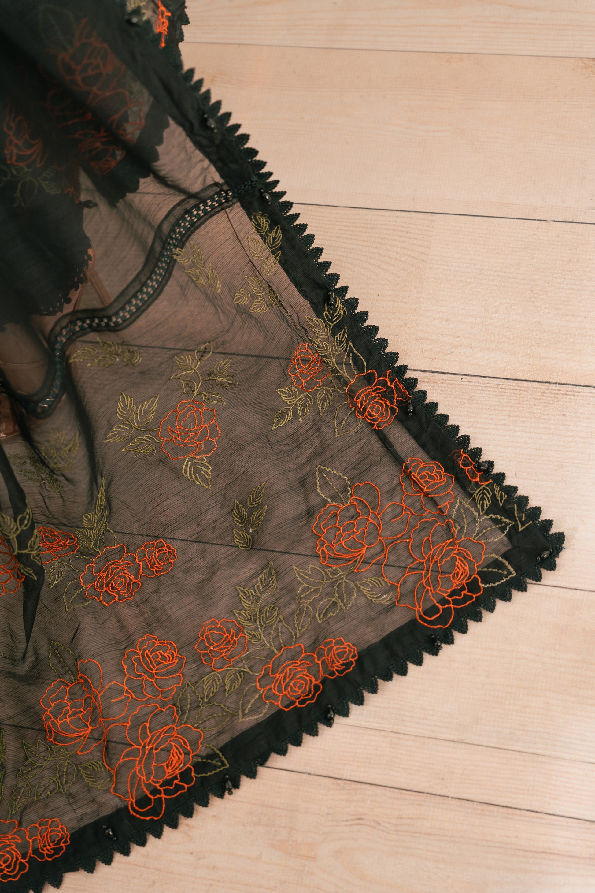 Make a statement at your summer festivities with this breathtaking black ensemble, expertly designed to elevate your celebration. The intricately embroidered white motifs on the shirt create a striking contrast, paired with sleek black trousers featuring subtle designs. The finishing touch is the vibrant marmalade-colored embroidery on the dupatta's pallu, adding a pop of color to this chic monochromatic ensemble.