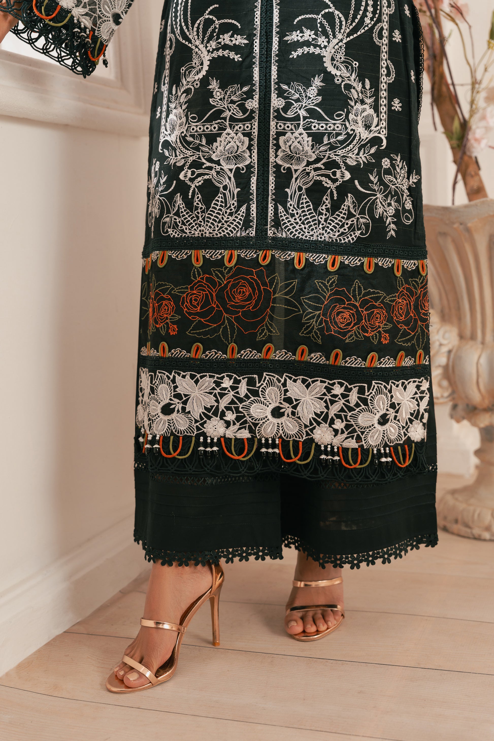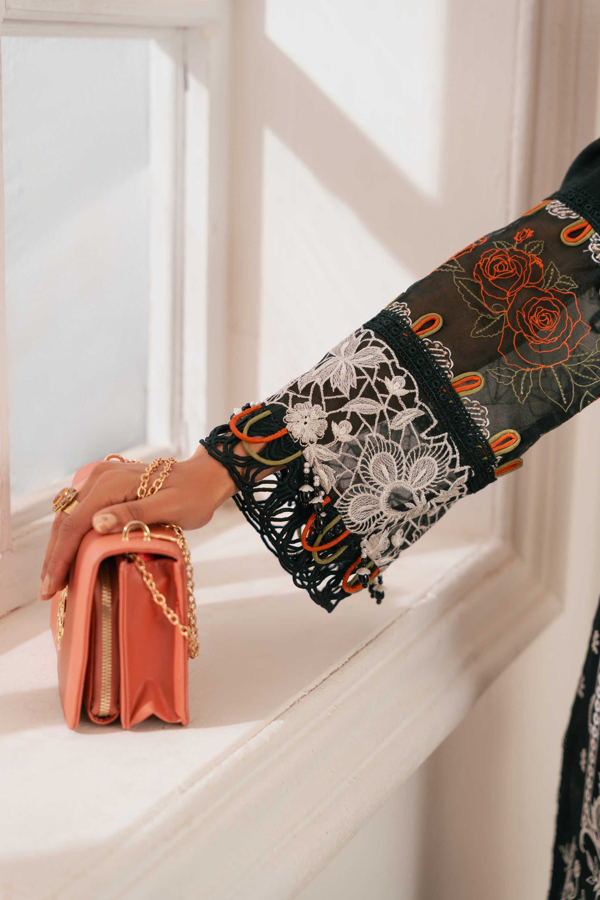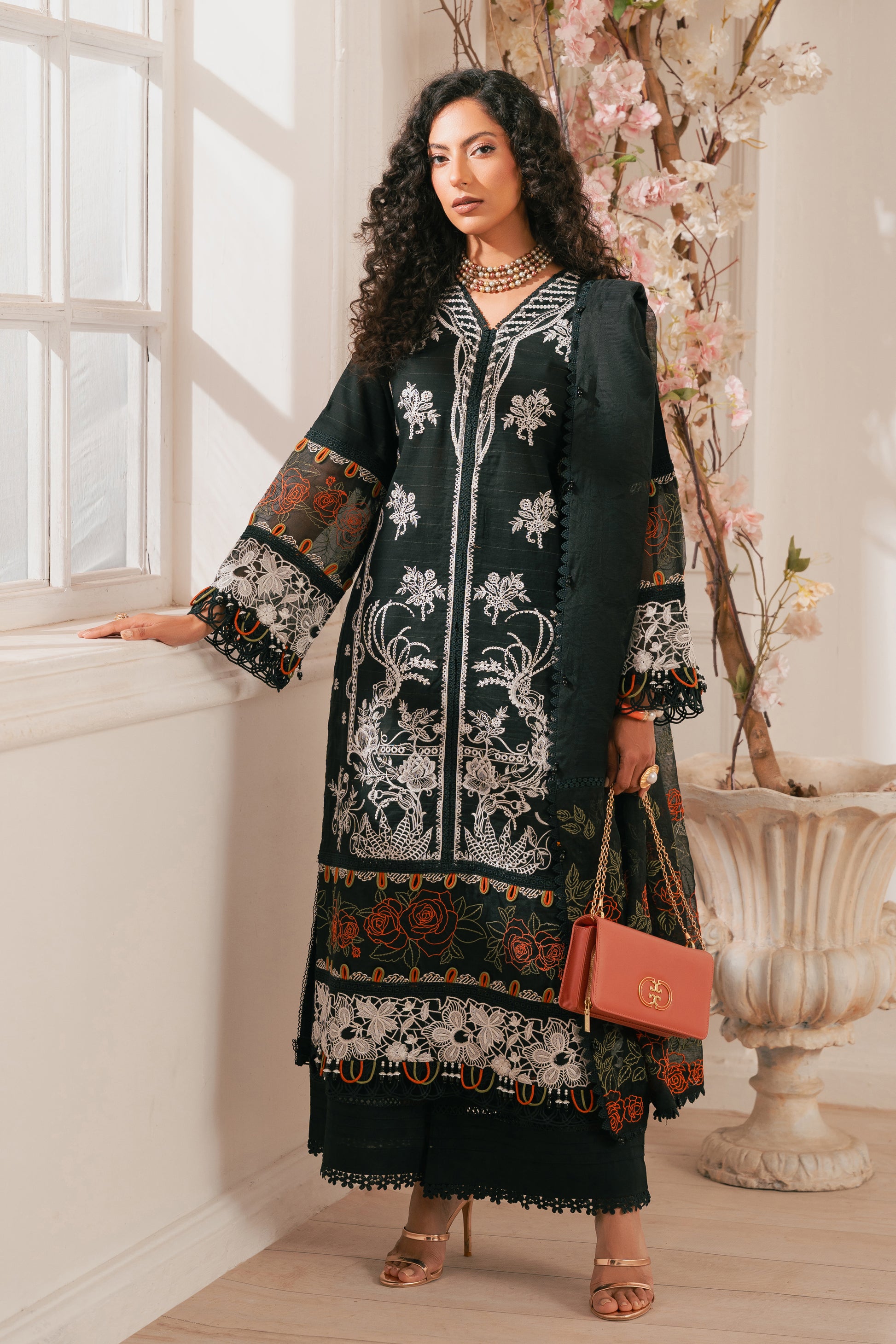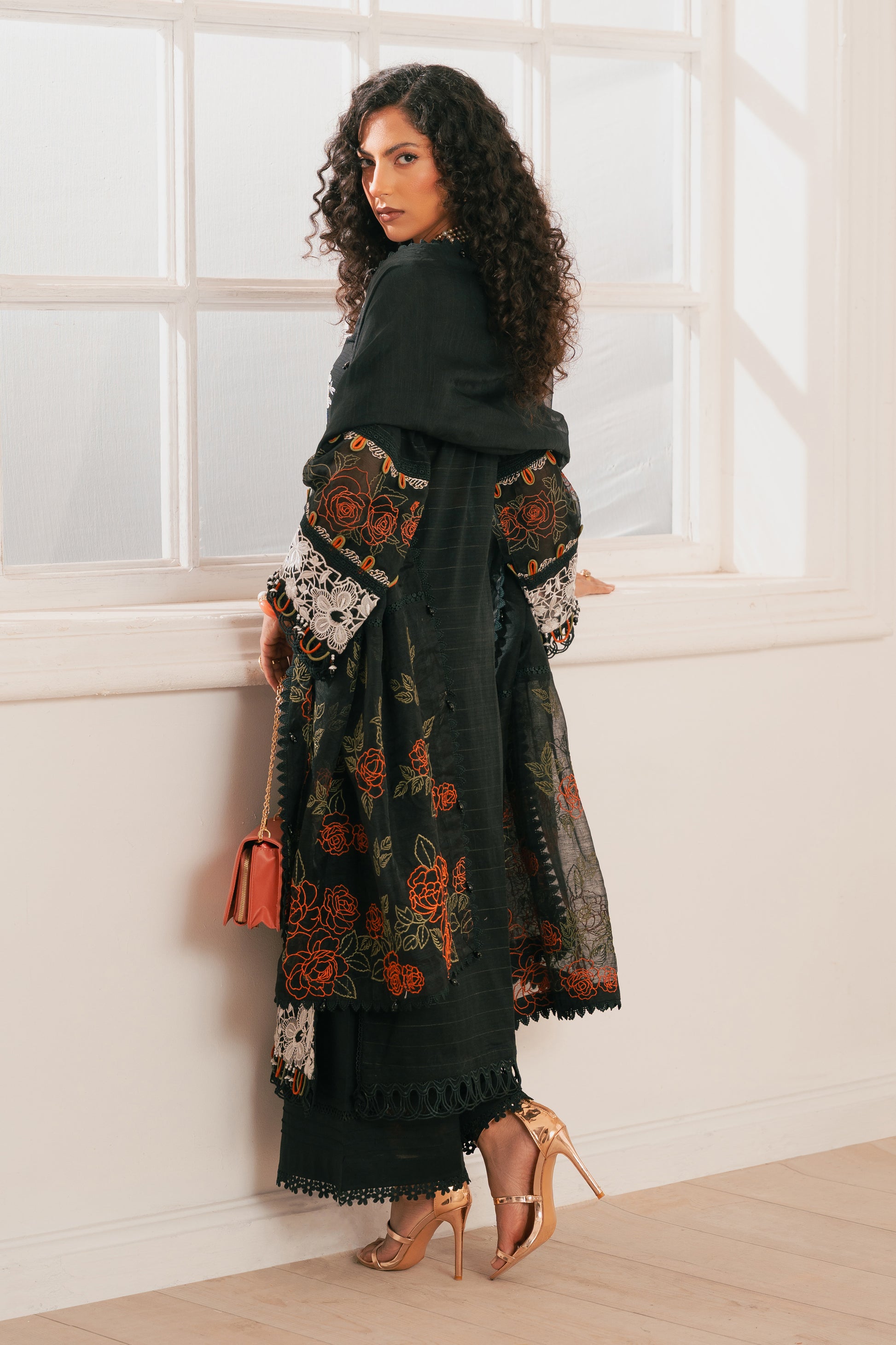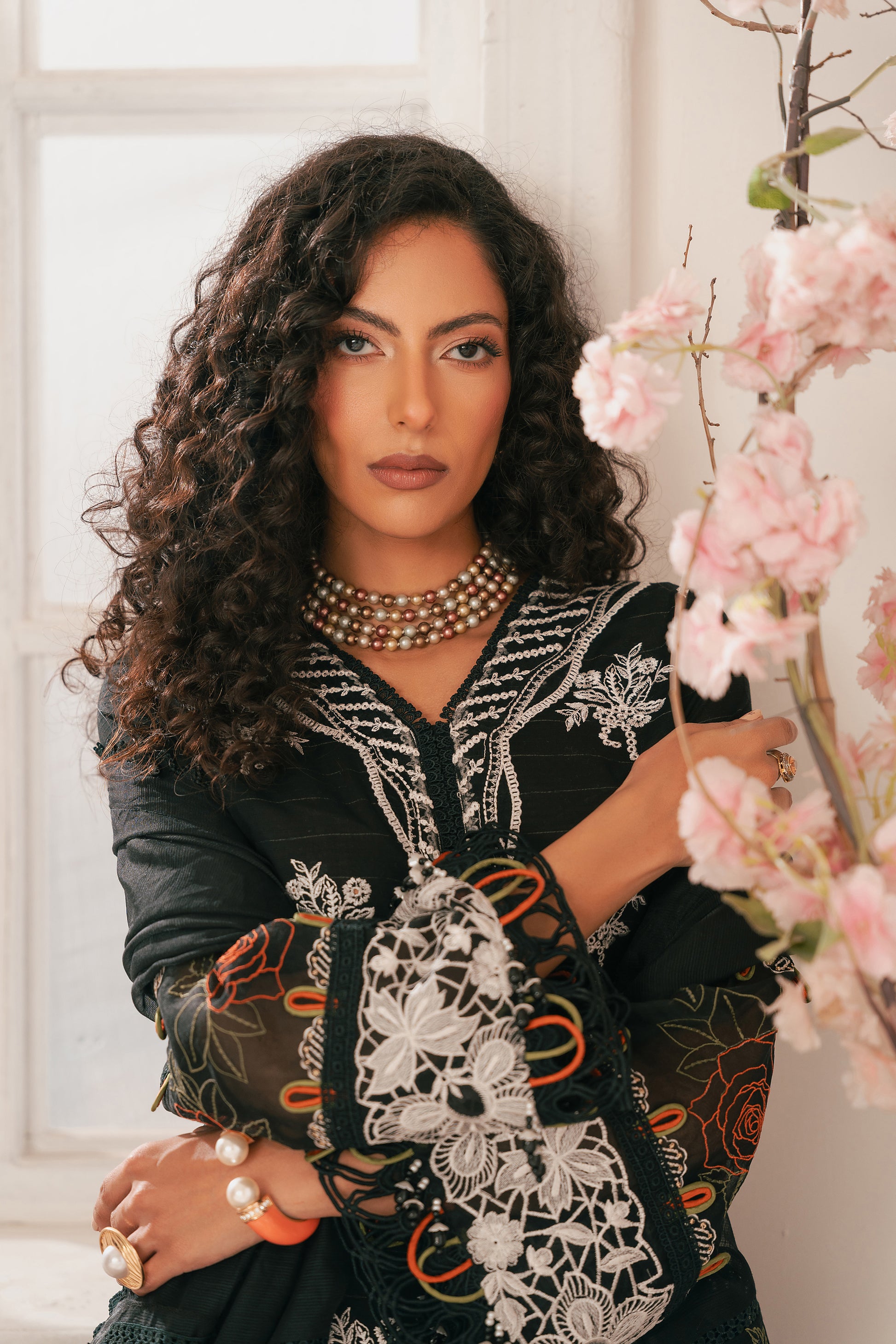 Make a statement at your summer festivities with this breathtaking black ensemble, expertly designed to elevate your celebration. The intricately embroidered white motifs on the shirt create a striking contrast, paired with sleek black trousers featuring subtle designs. The finishing touch is the vibrant marmalade-colored embroidery on the dupatta's pallu, adding a pop of color to this chic monochromatic ensemble.