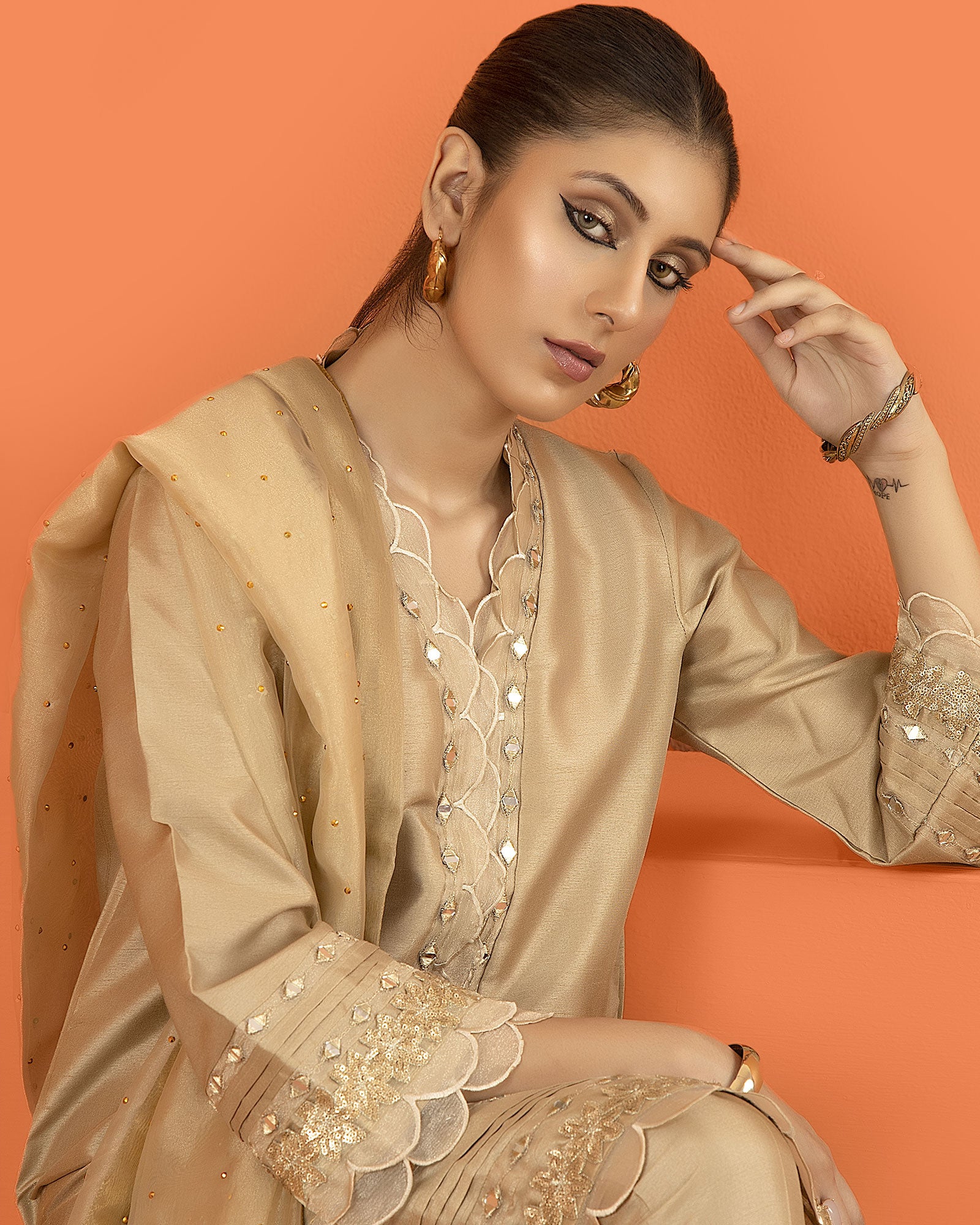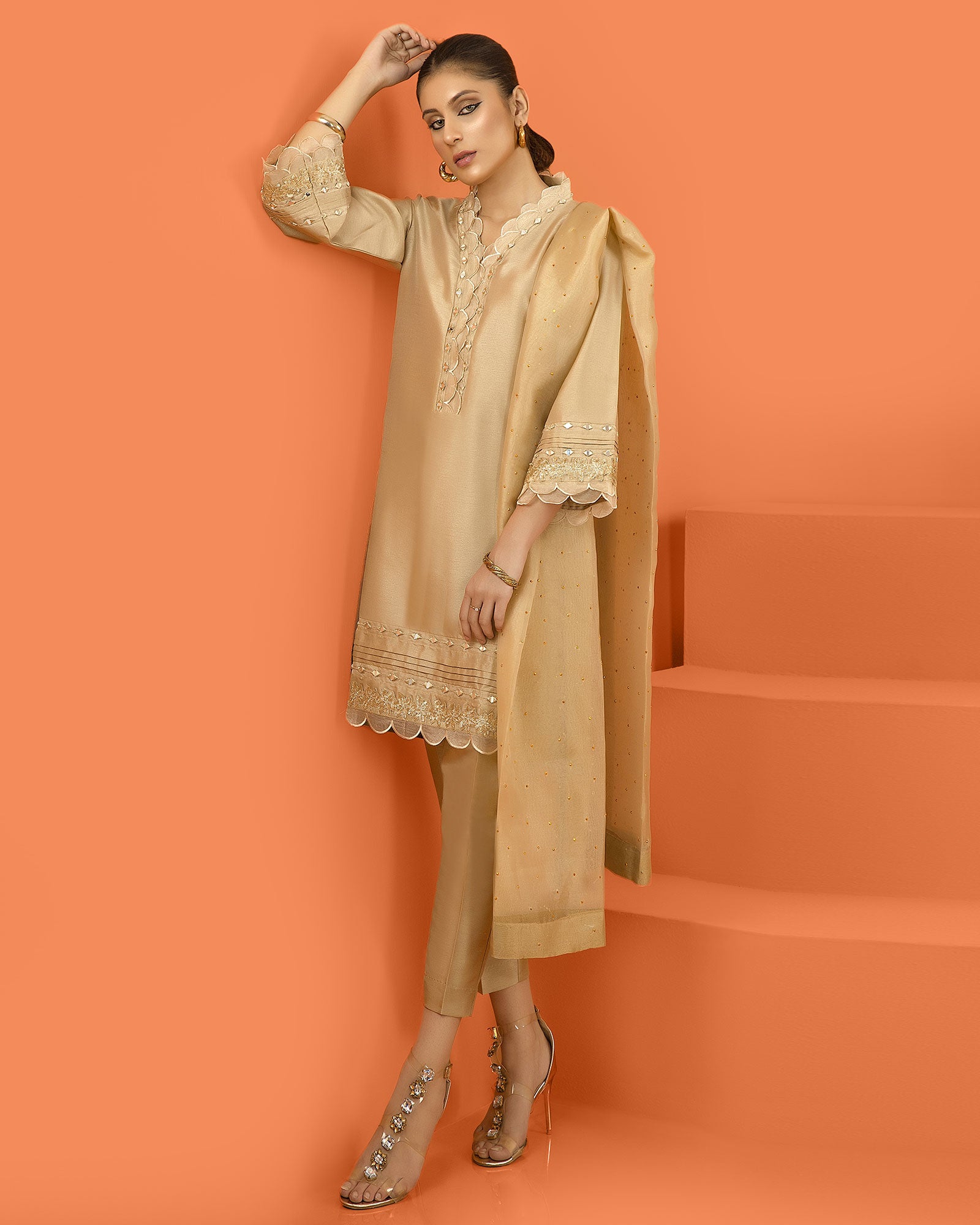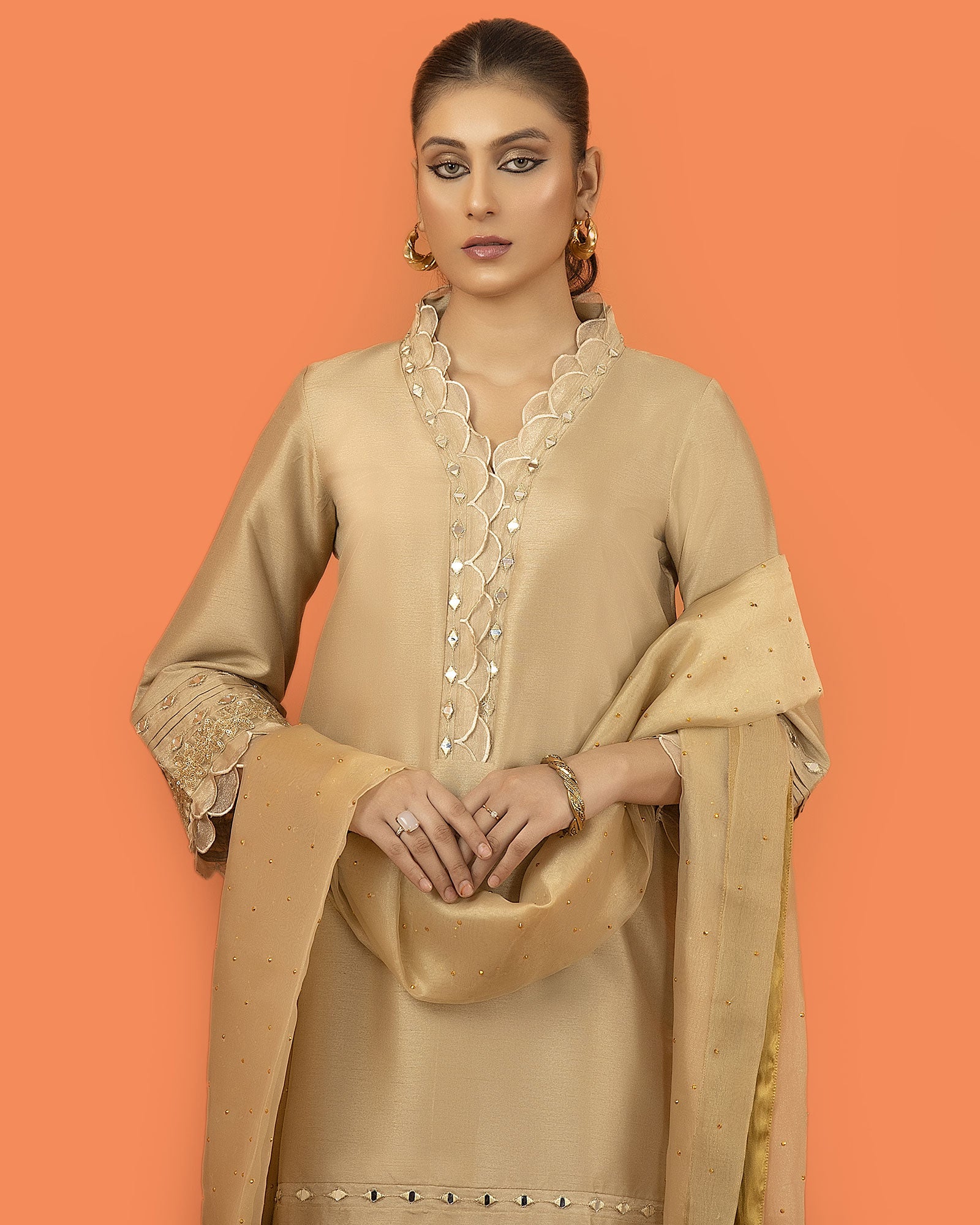 Crystaline is one of our favourite designs from our upcoming luxury pret collection. Artistically rendered on baig colour raw silk base with shades of golden zari embroidery & laces, the outfit is paired with a fully organza dupatta with cigratte pants. A combination of chosen laces finish off the entire outfit beautifully. Absolutely love this outfit -truly detailed to perfection
