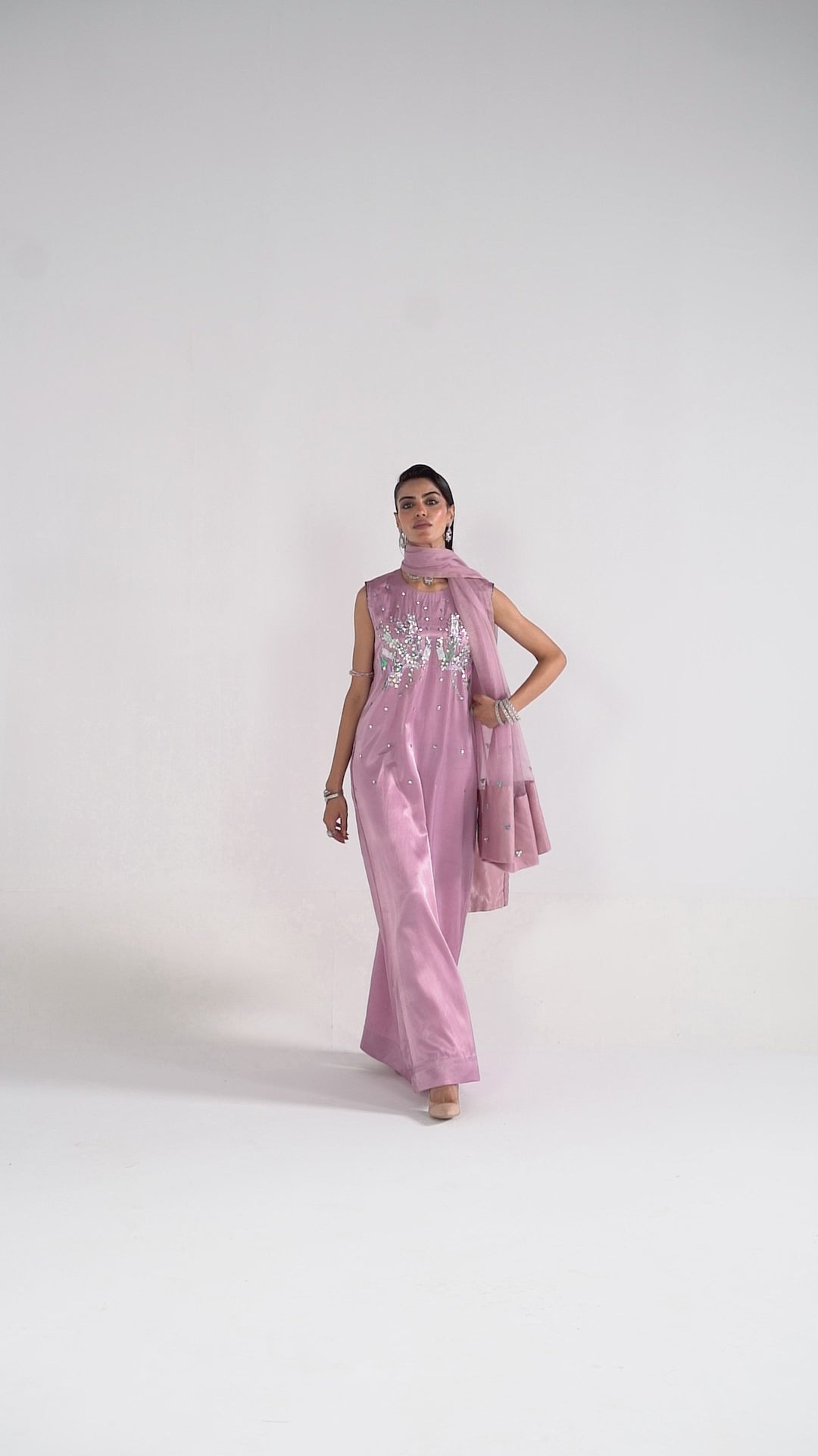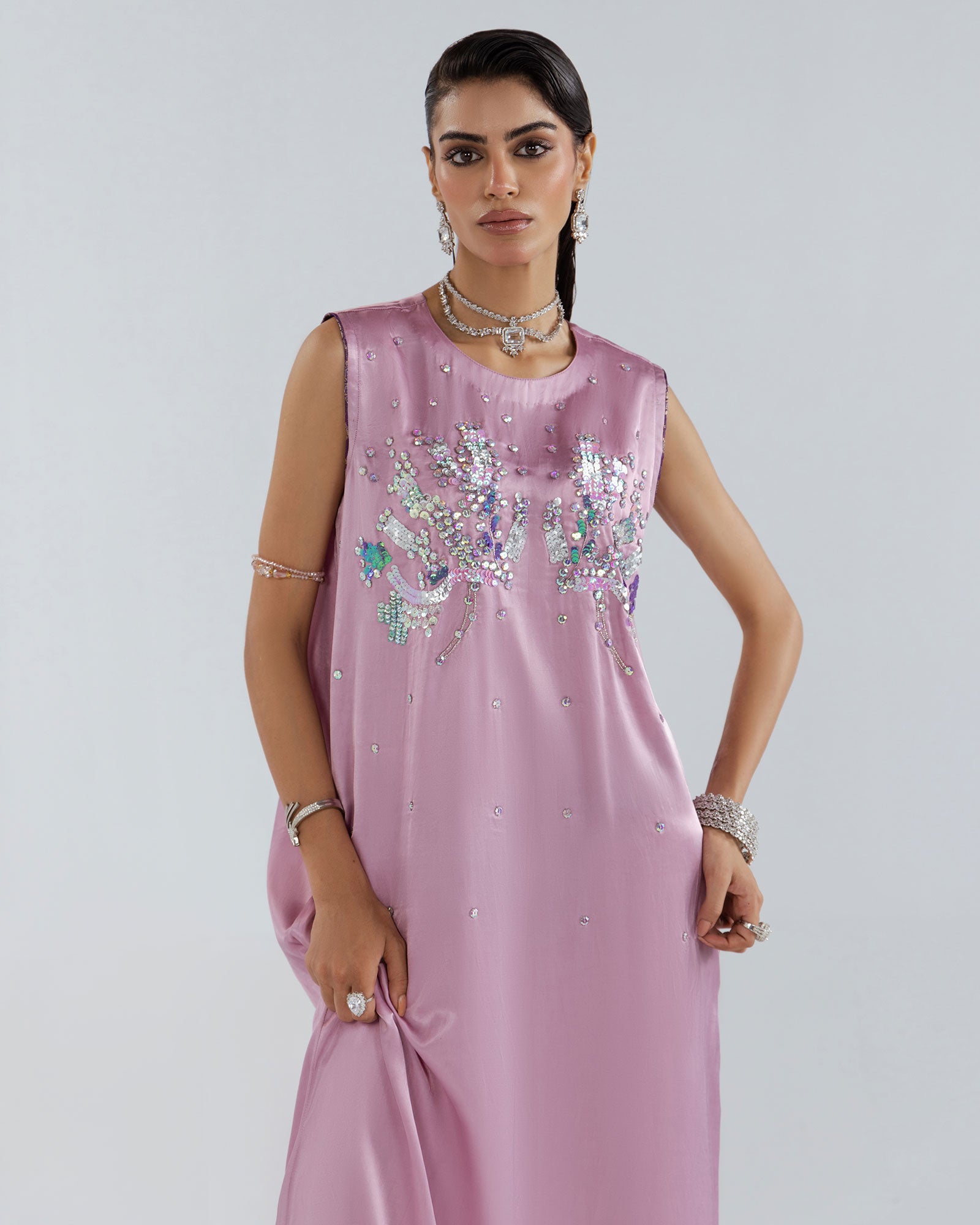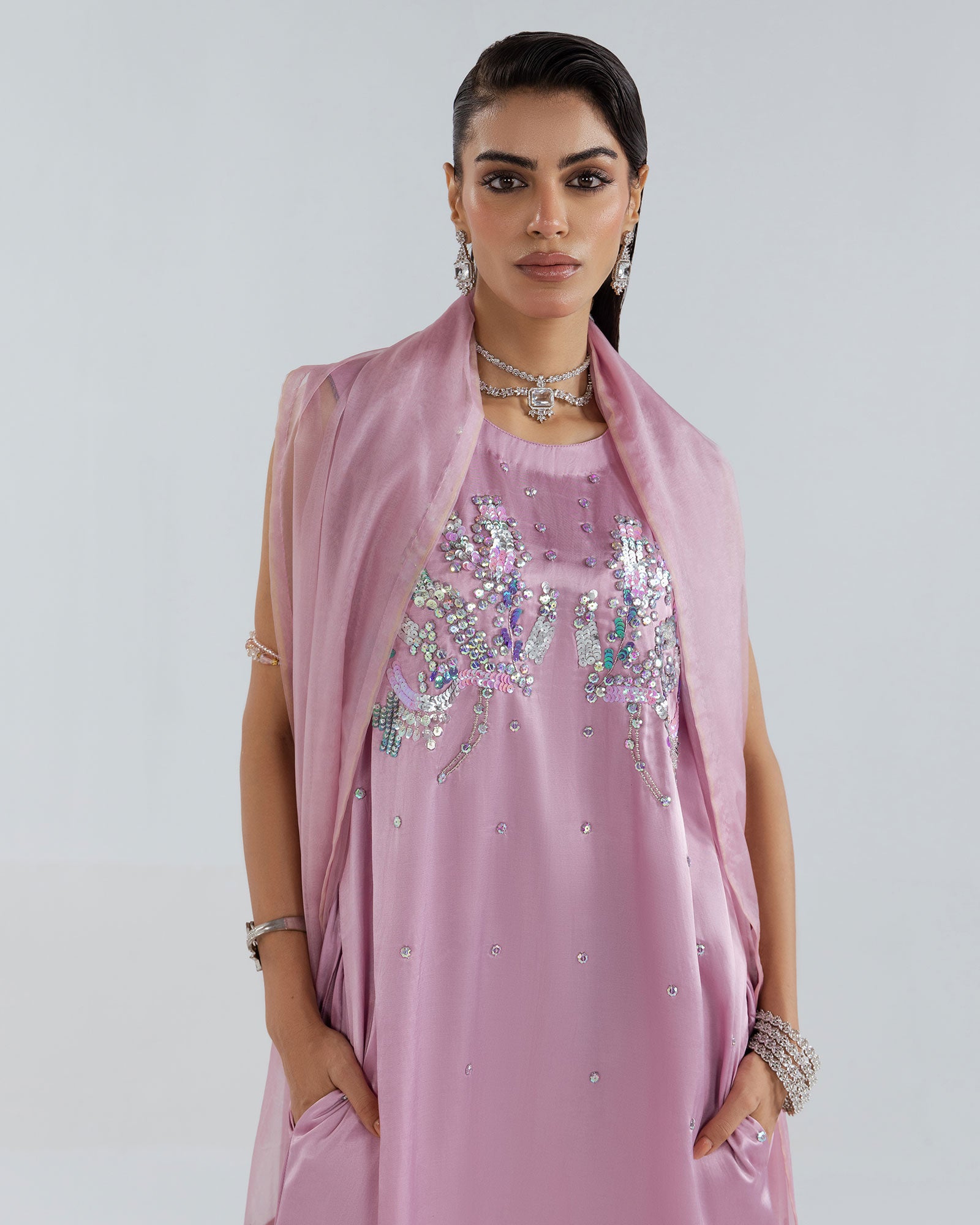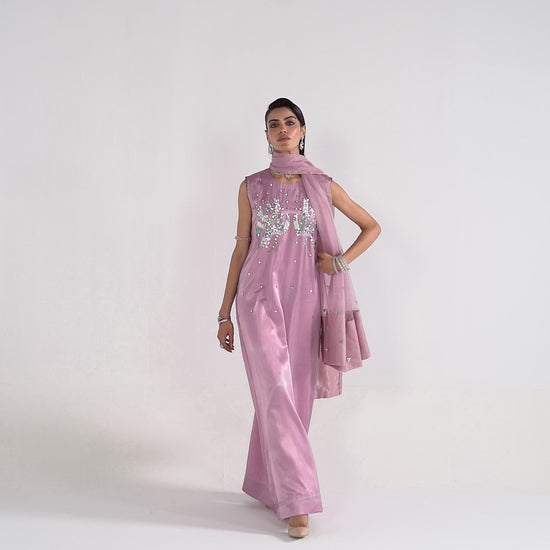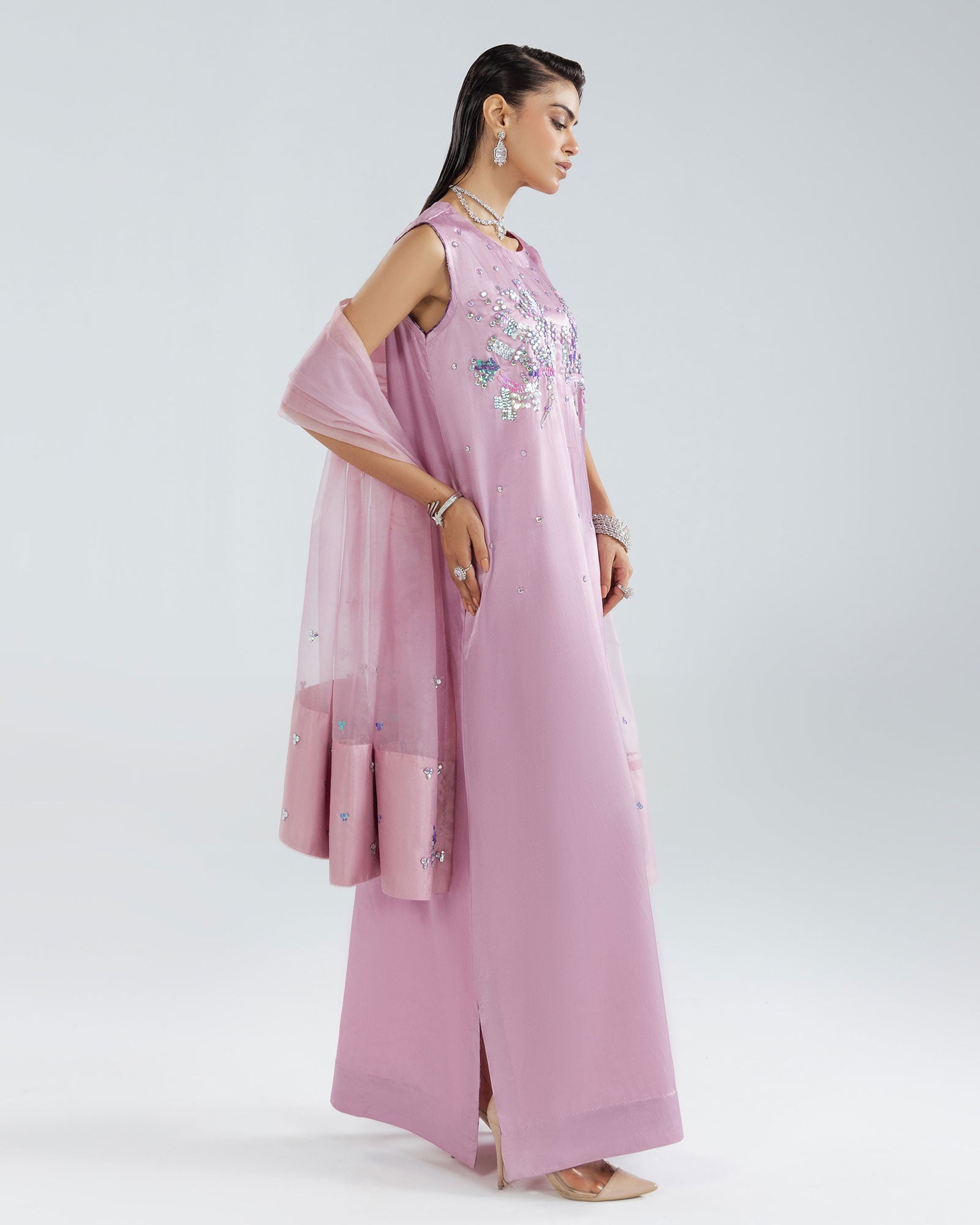 Porcelain Blush pink, Straight cotton silk maxi dress, hand embellished with glittering crystals and pink colored French and Italian sequins. It’s designed in a slim silhouette with bold side slit.Matching embellished organza dupatta Included with border embellised.