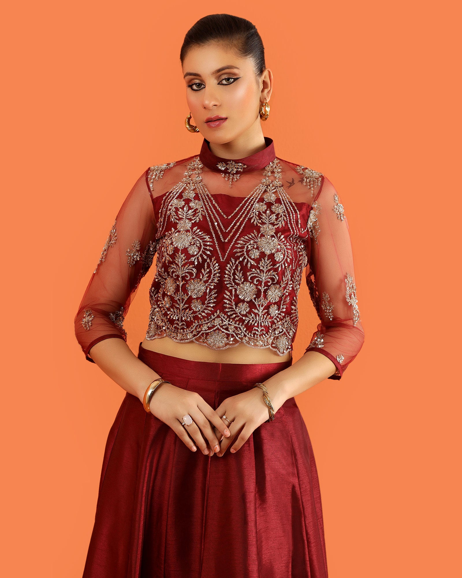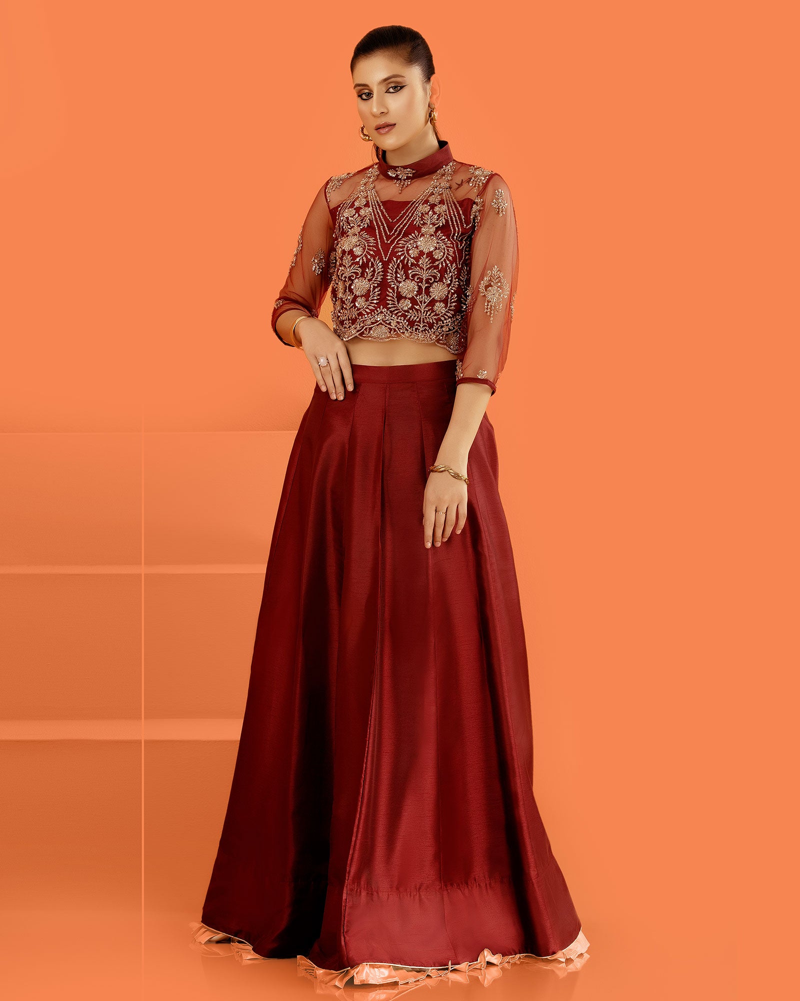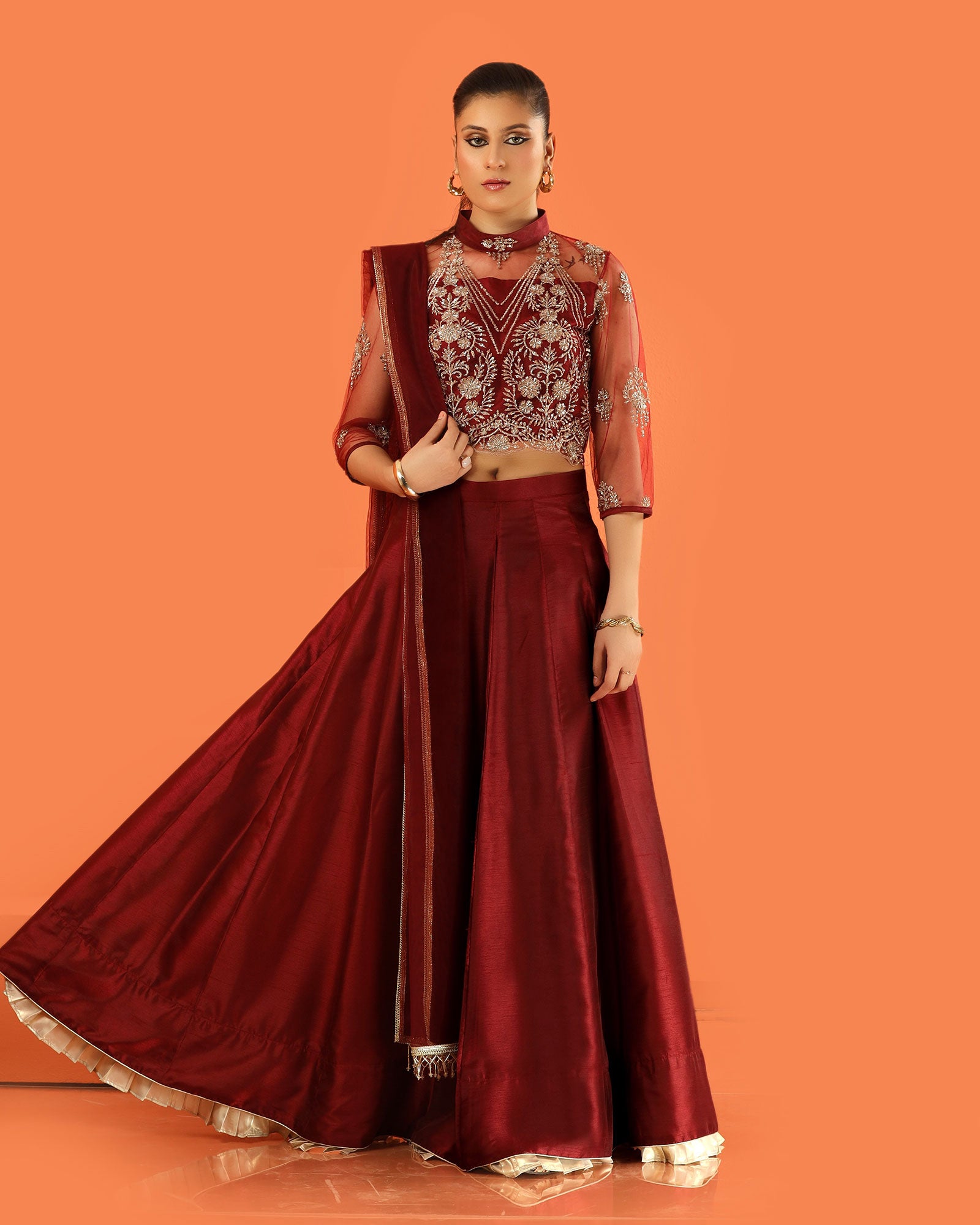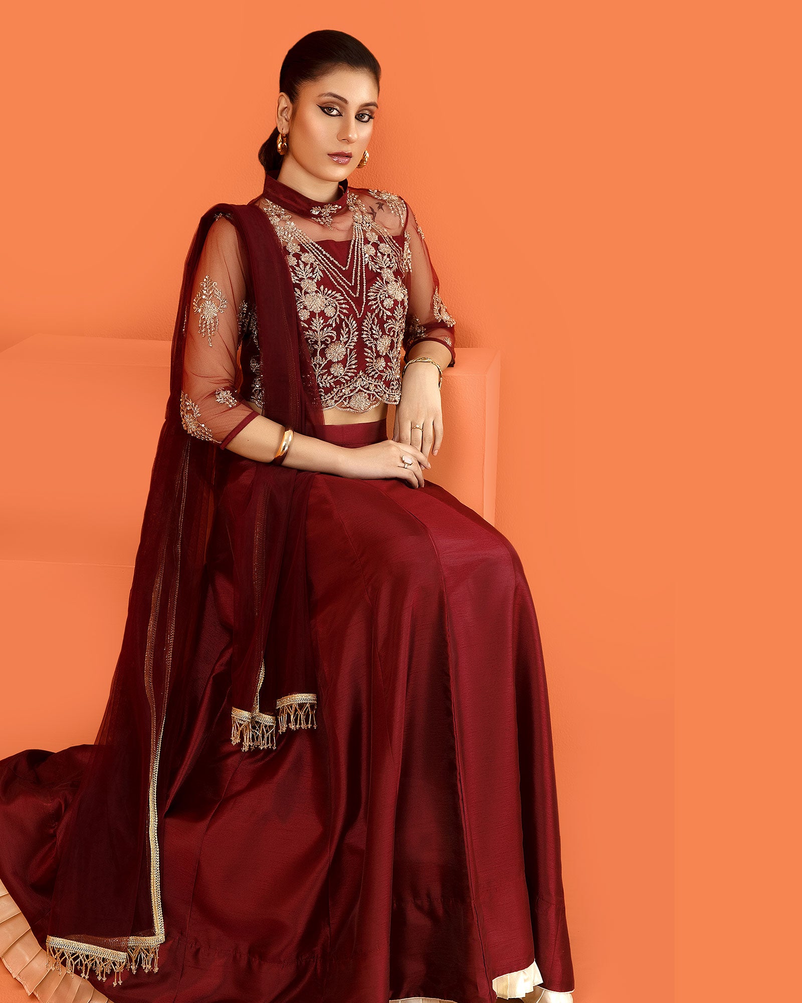 The maroon lehenga with choli features an elegantly, hand embroidery with goden dabka, naqshi, sitara and cut dana sworovski hand embellishment work on choli with plan lehenga. And the organza net dupatta embellishment with pearl laces on two sides. This article shows the high fashion tradional and elegant looks.