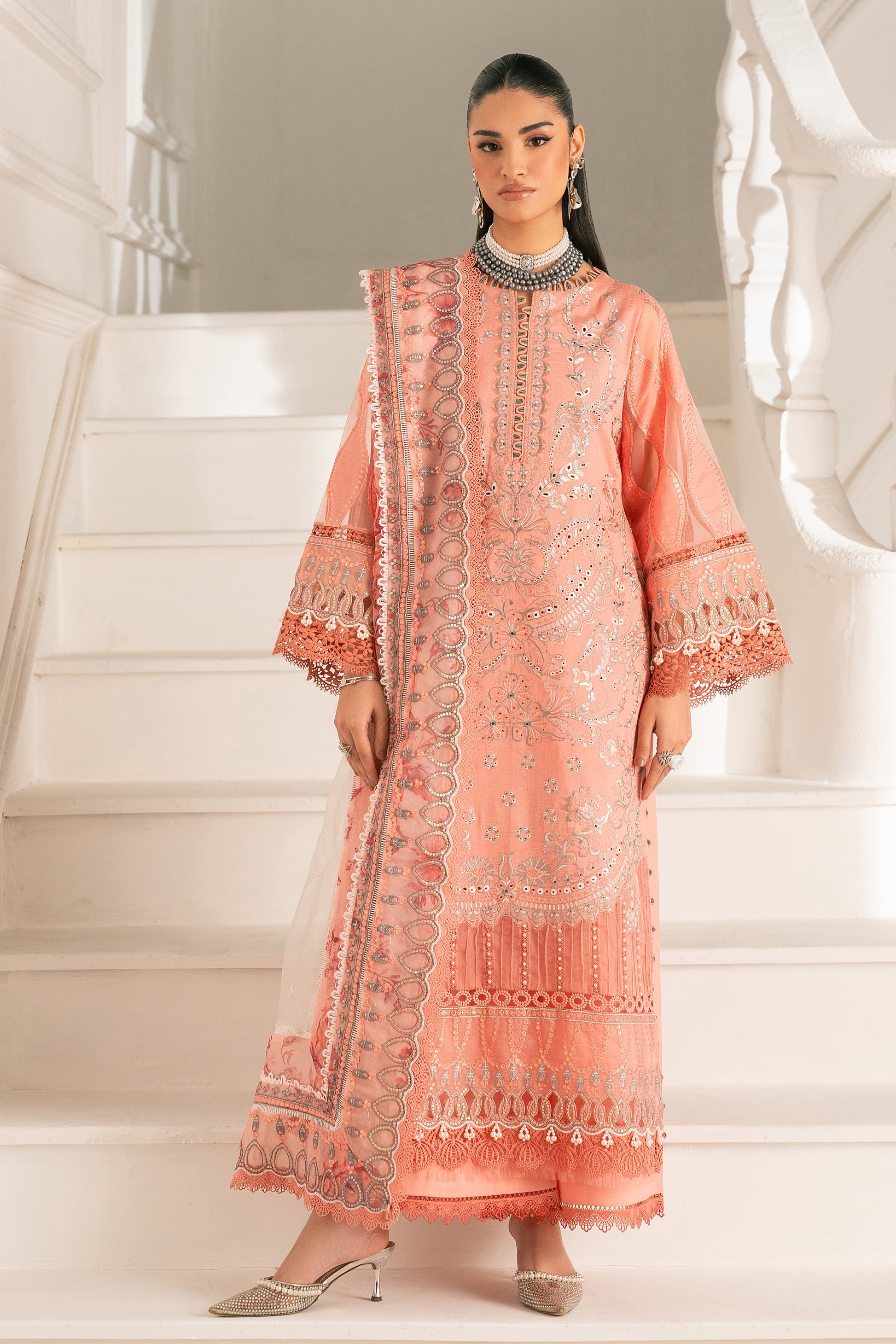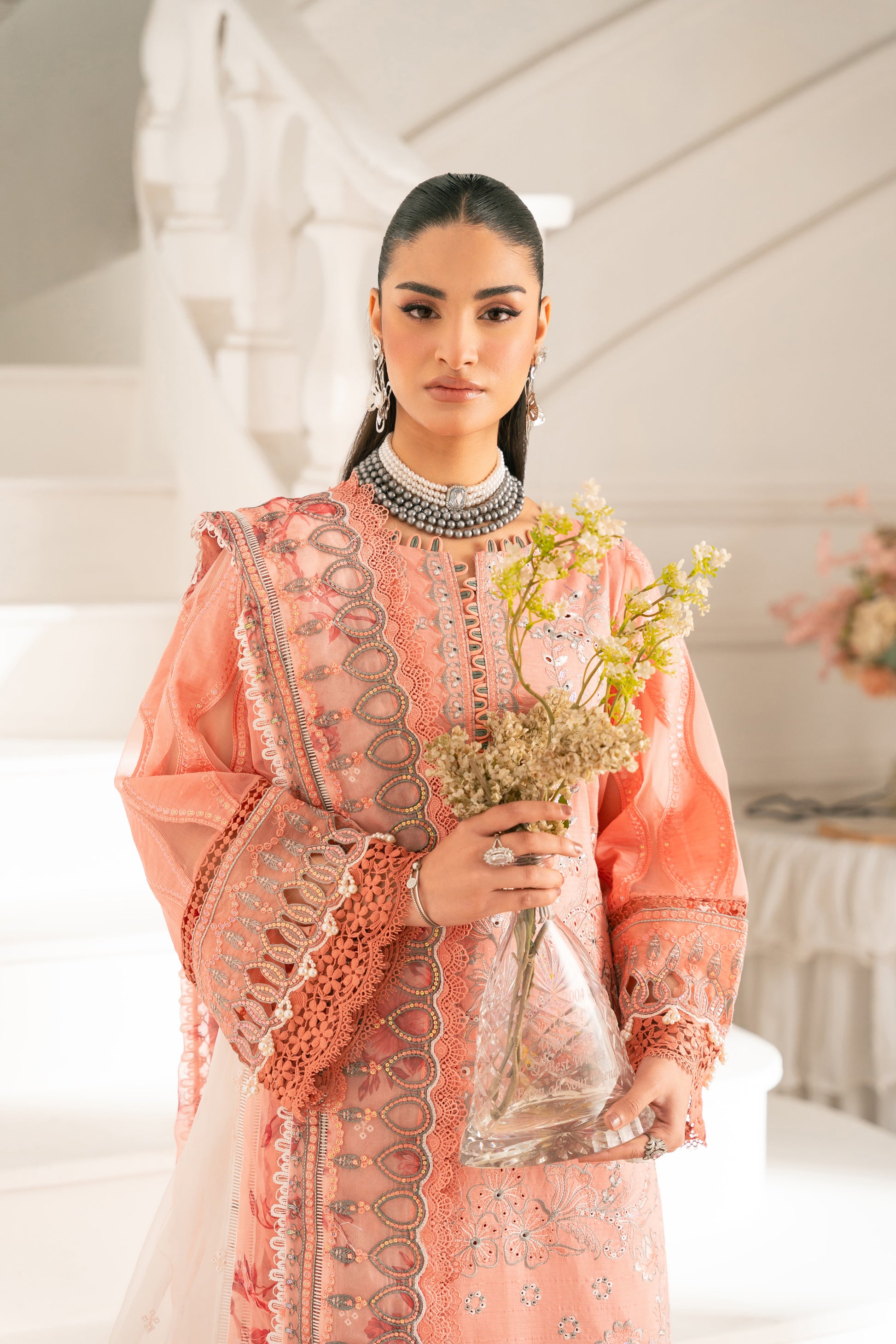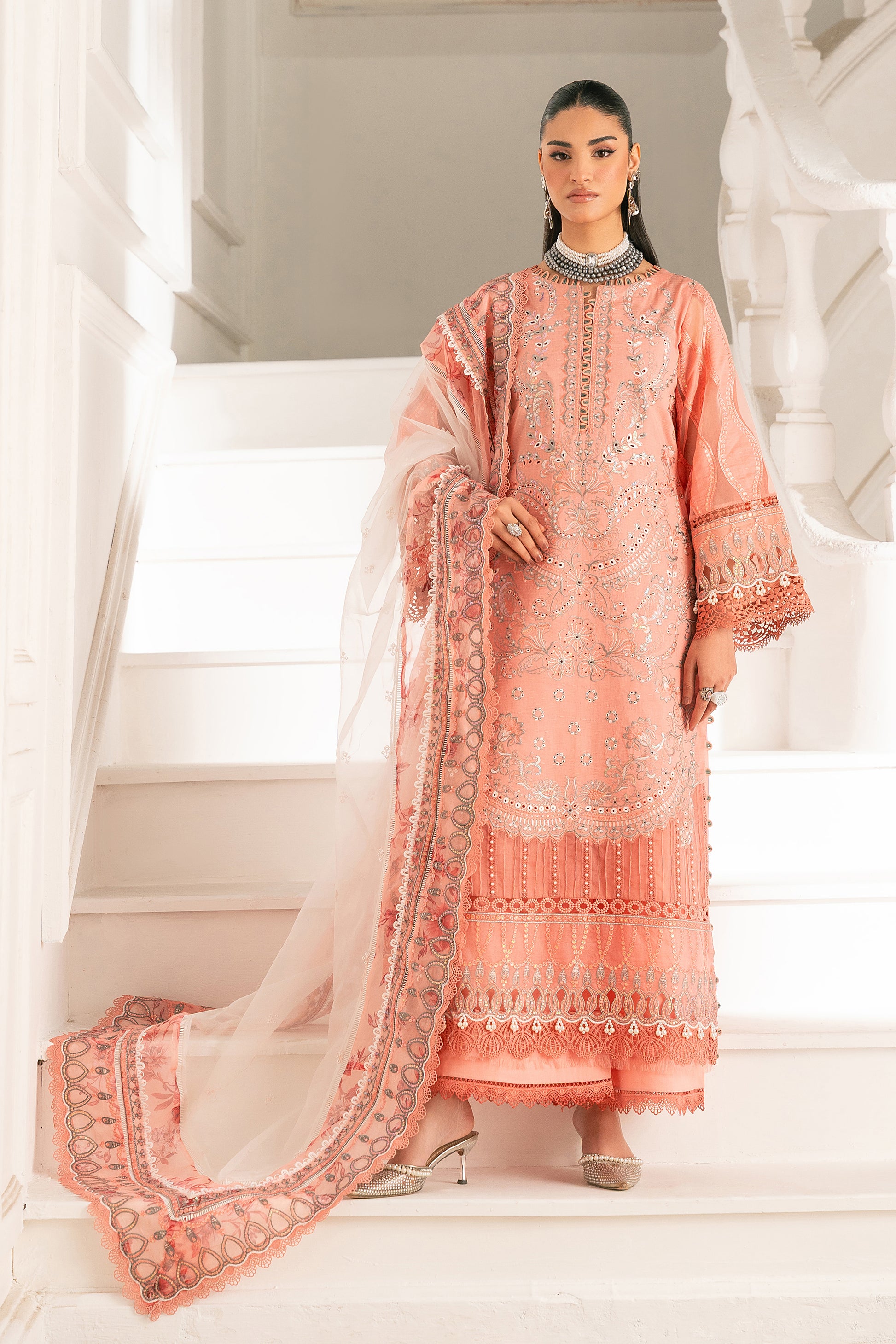 This outfit also showcases a lovely combination of traditional patterns and vibrant colours. The salmon base color is elegantly adorned with a mixture of bold and intricate embroidery, while the printed dupatta with a floral composition adds a contrasting colour with ivory color. Introduce sophistication to your wardrobe with our exquisite salmon base colour design featuring elegance. Complementing the ensemble are the same base pants, featuring a grey & ivory embroidery that ties the look together seamlessly. This striking combination of textures and patterns creates a captivating silhouette, perfect for special gatherings.