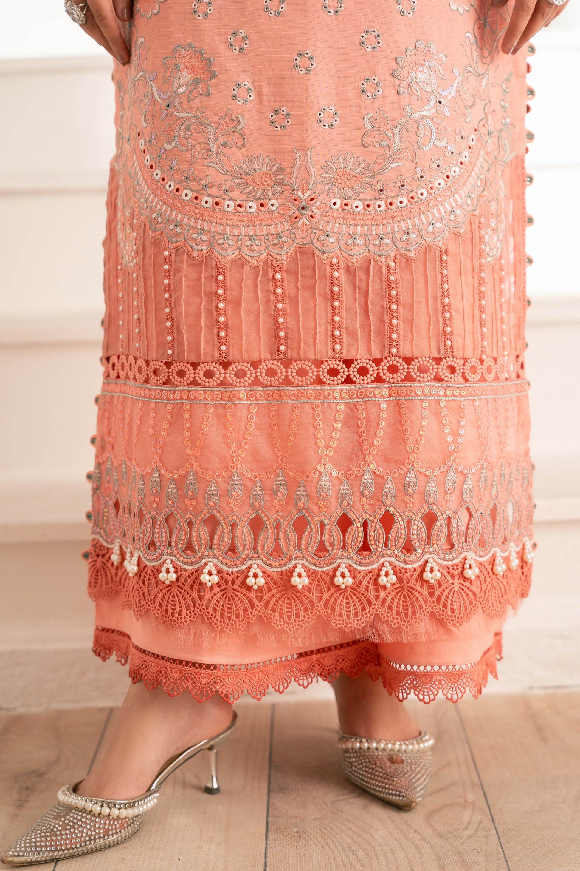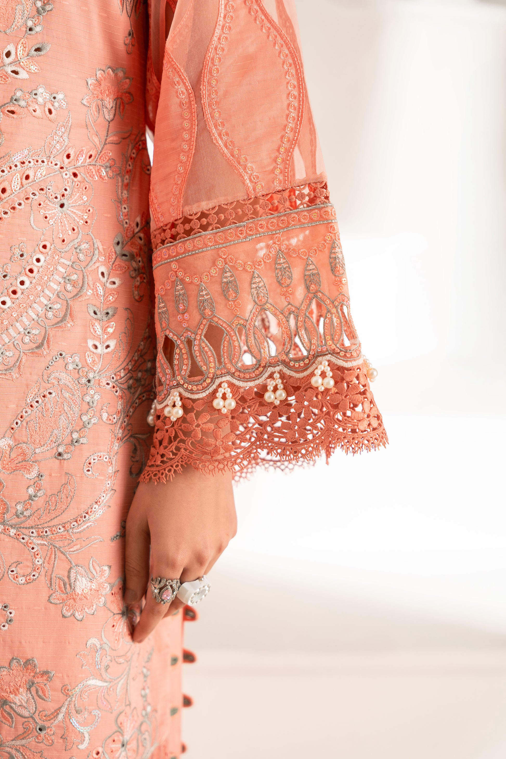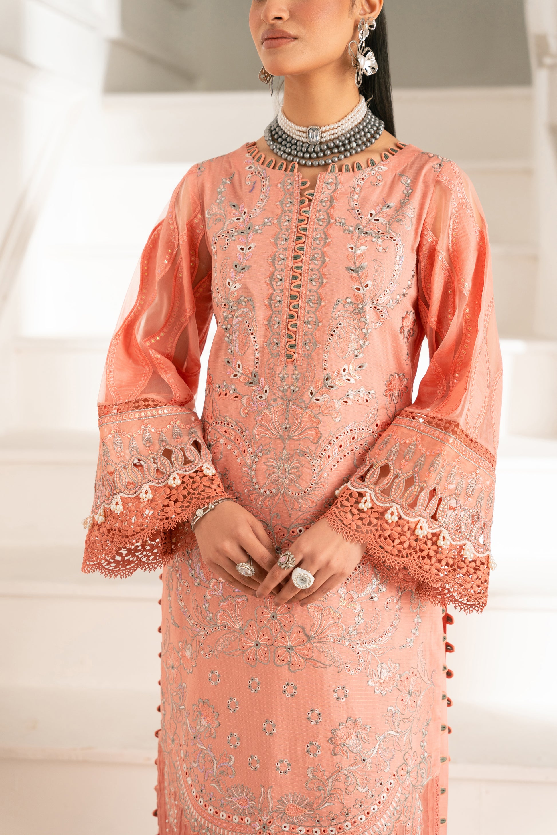This outfit also showcases a lovely combination of traditional patterns and vibrant colours. The salmon base color is elegantly adorned with a mixture of bold and intricate embroidery, while the printed dupatta with a floral composition adds a contrasting colour with ivory color. Introduce sophistication to your wardrobe with our exquisite salmon base colour design featuring elegance. Complementing the ensemble are the same base pants, featuring a grey & ivory embroidery that ties the look together seamlessly. This striking combination of textures and patterns creates a captivating silhouette, perfect for special gatherings.