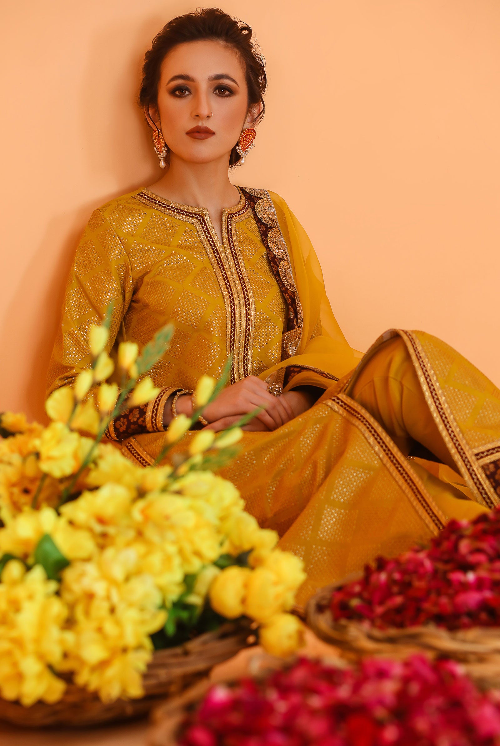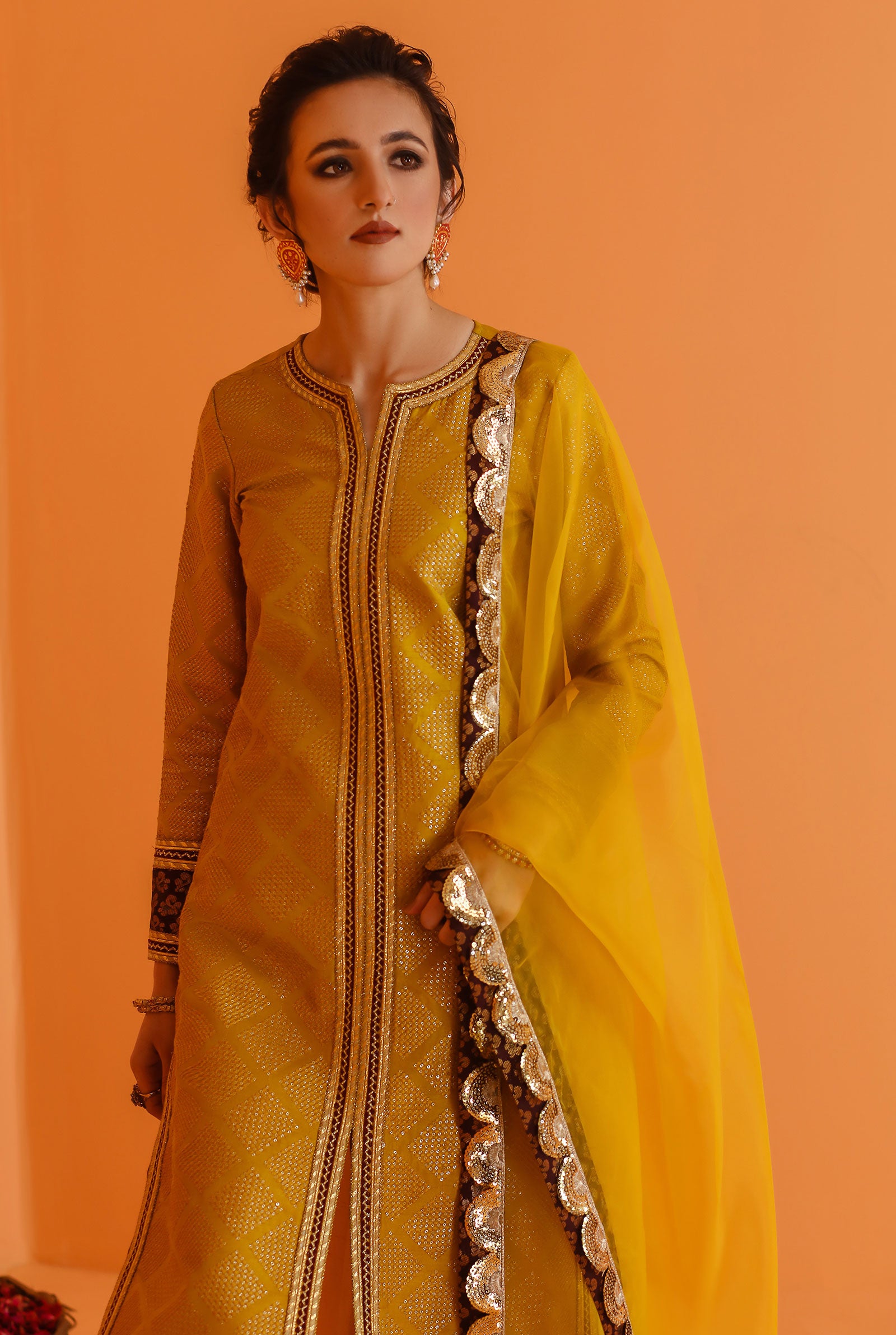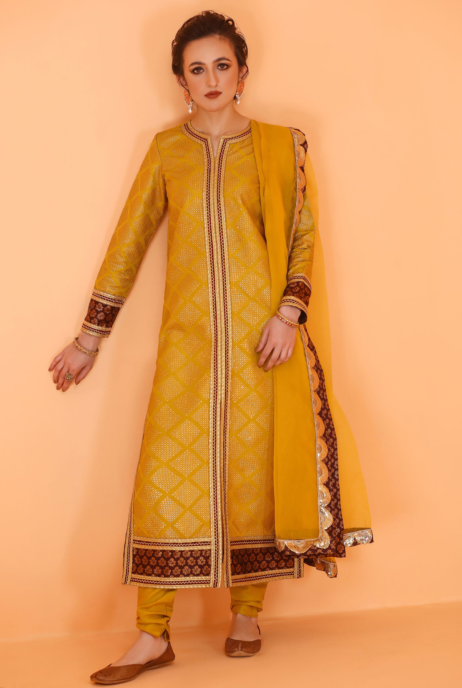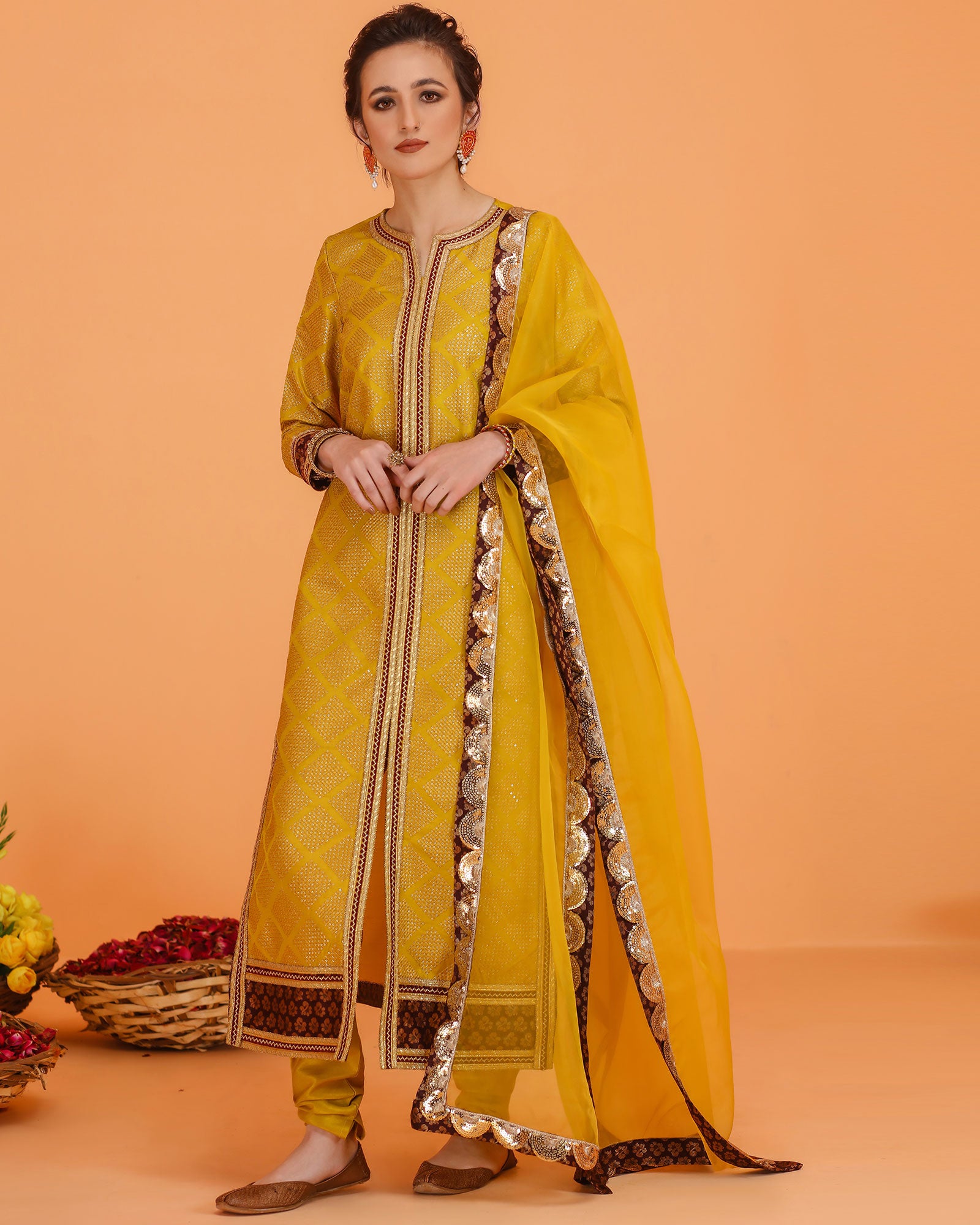 The trending mustard color of this article has a long shirt with a front open cut and a pair of churidar pajamas. And the organza dupatta comes with sequin work with embellishing and taping with all around.