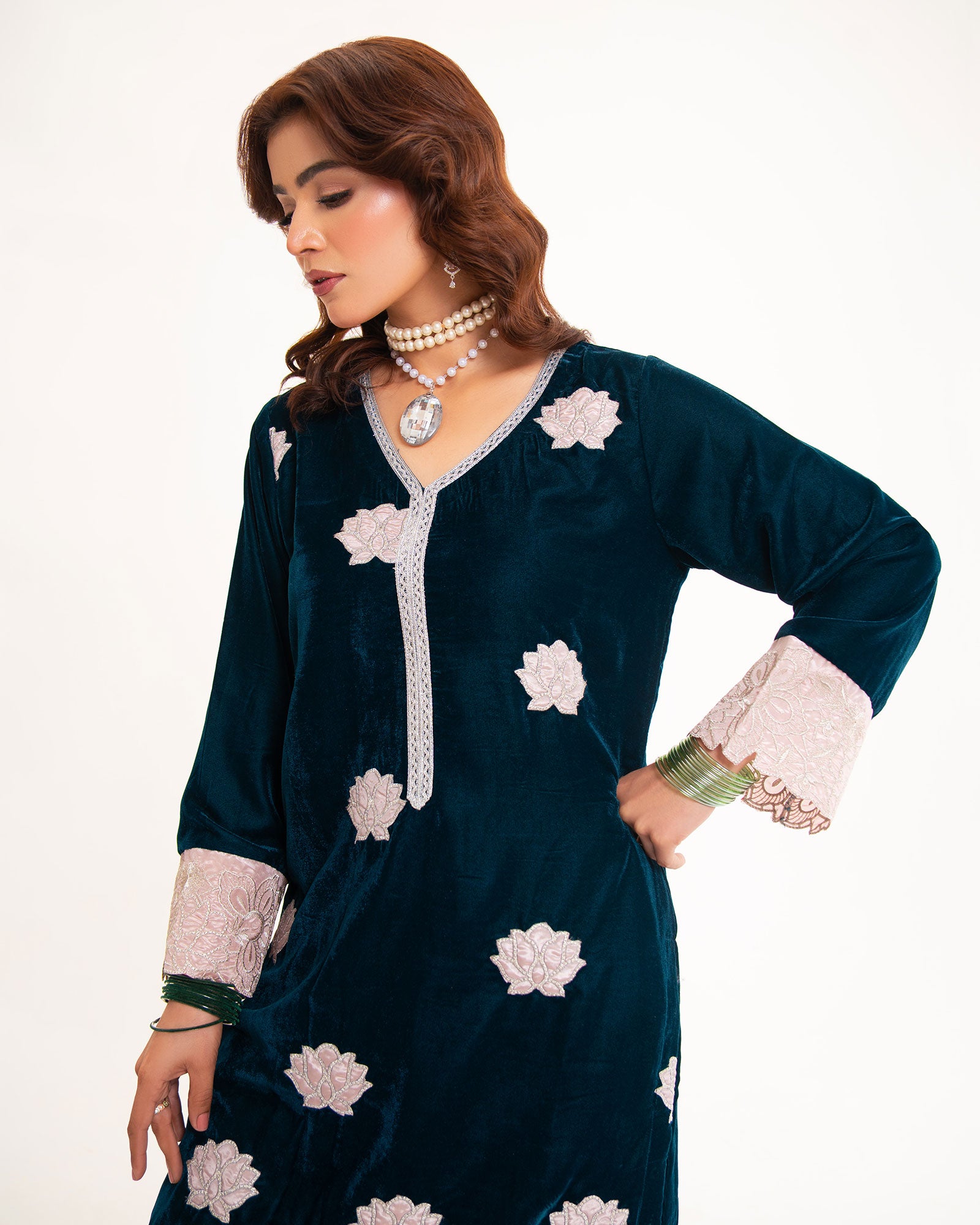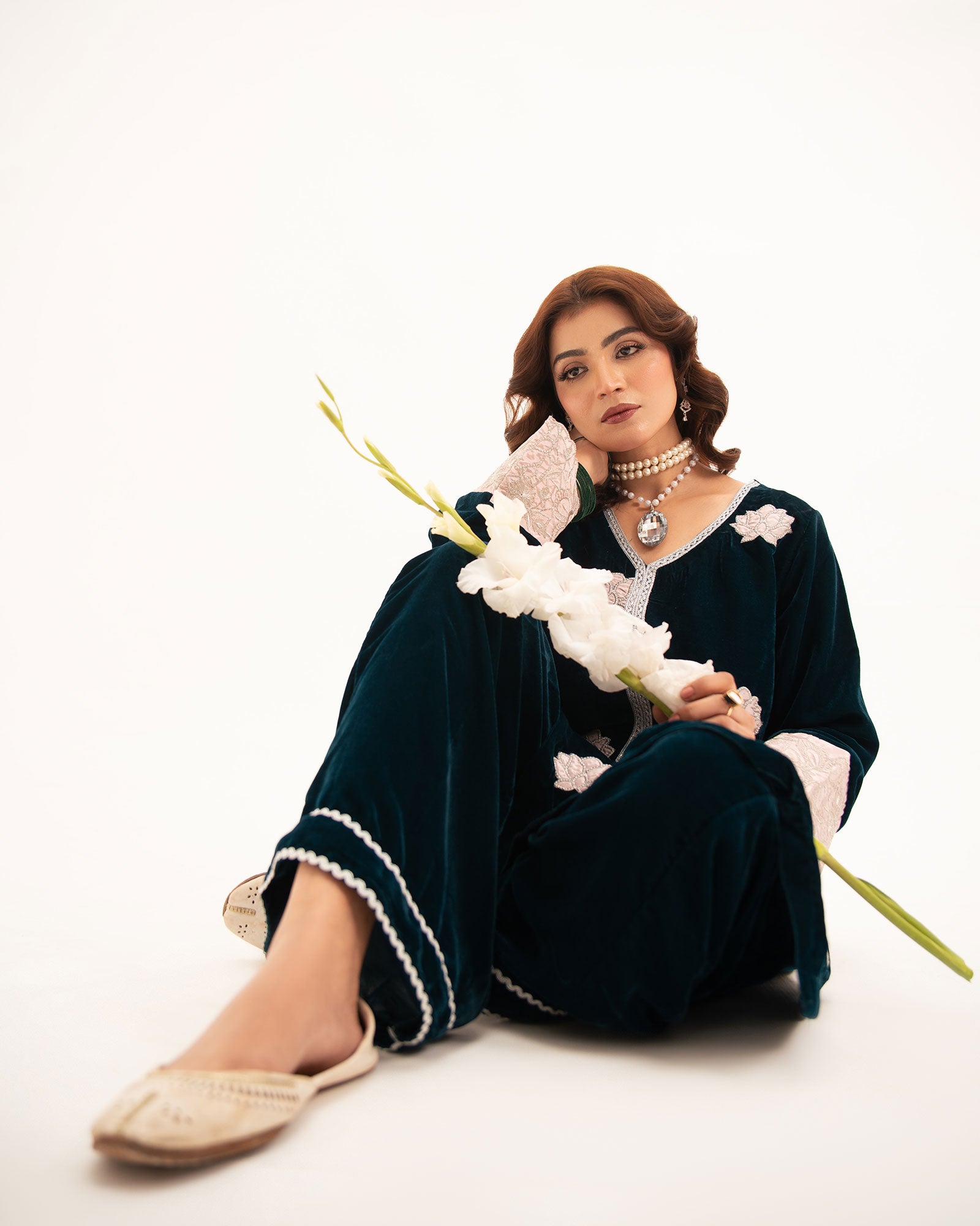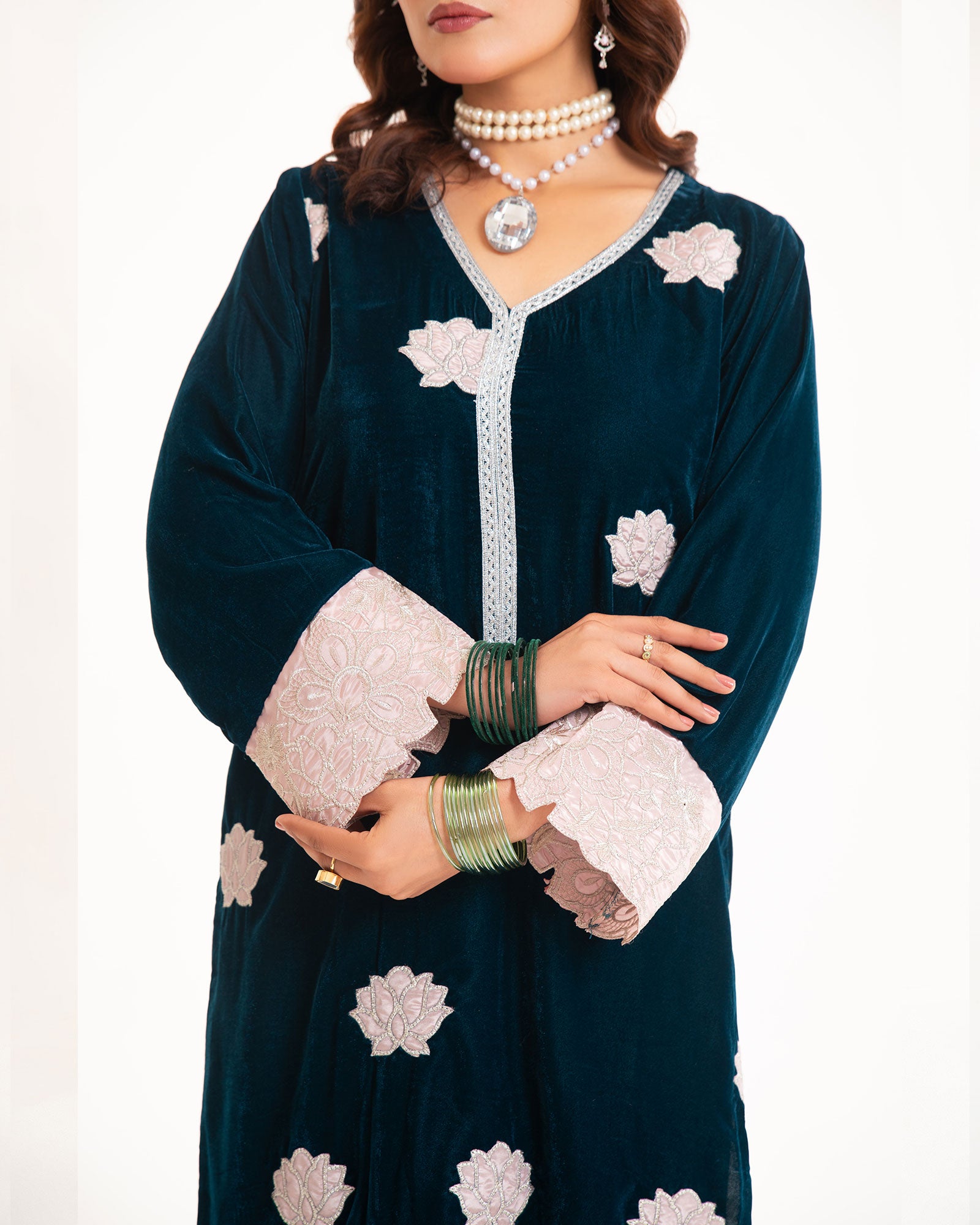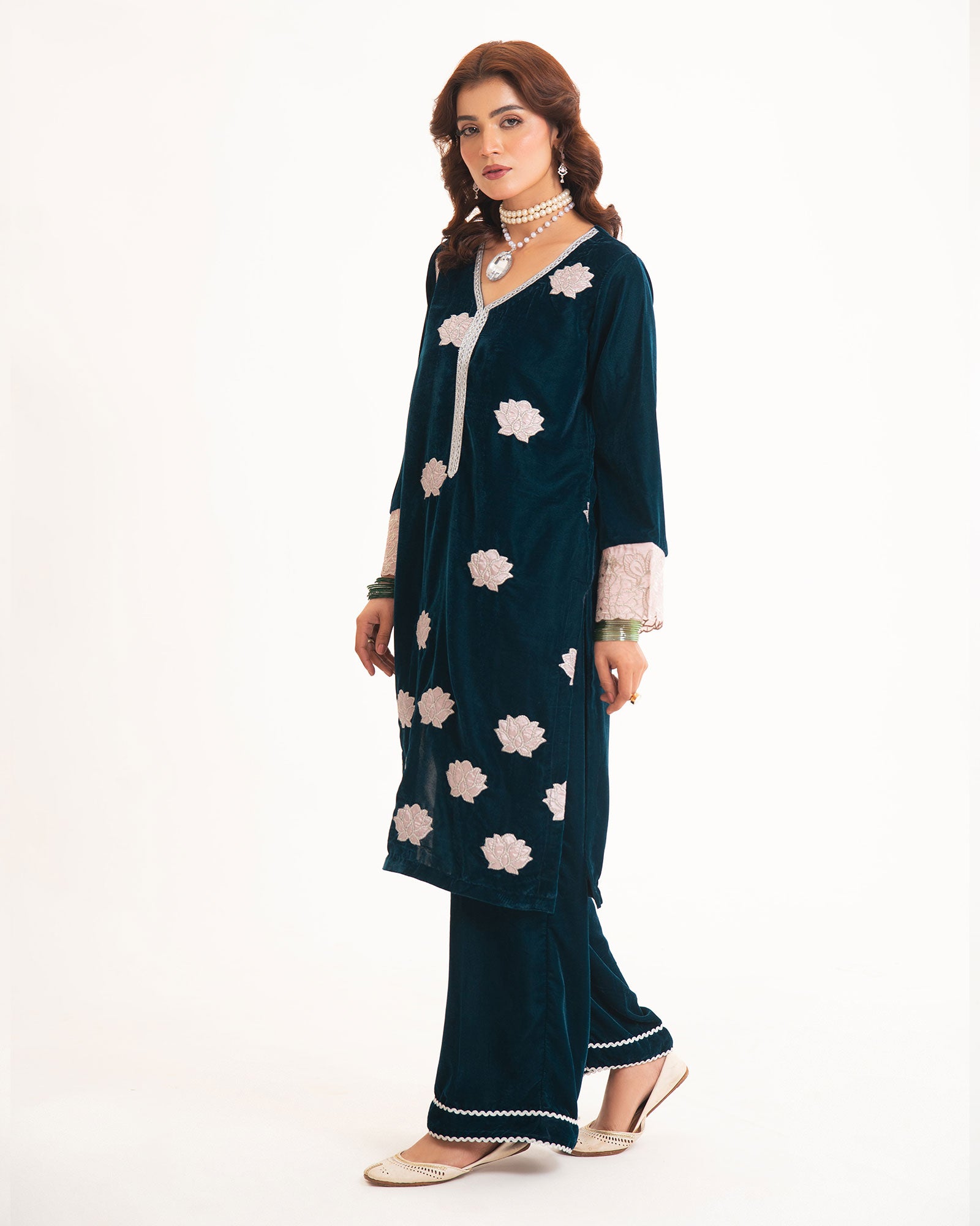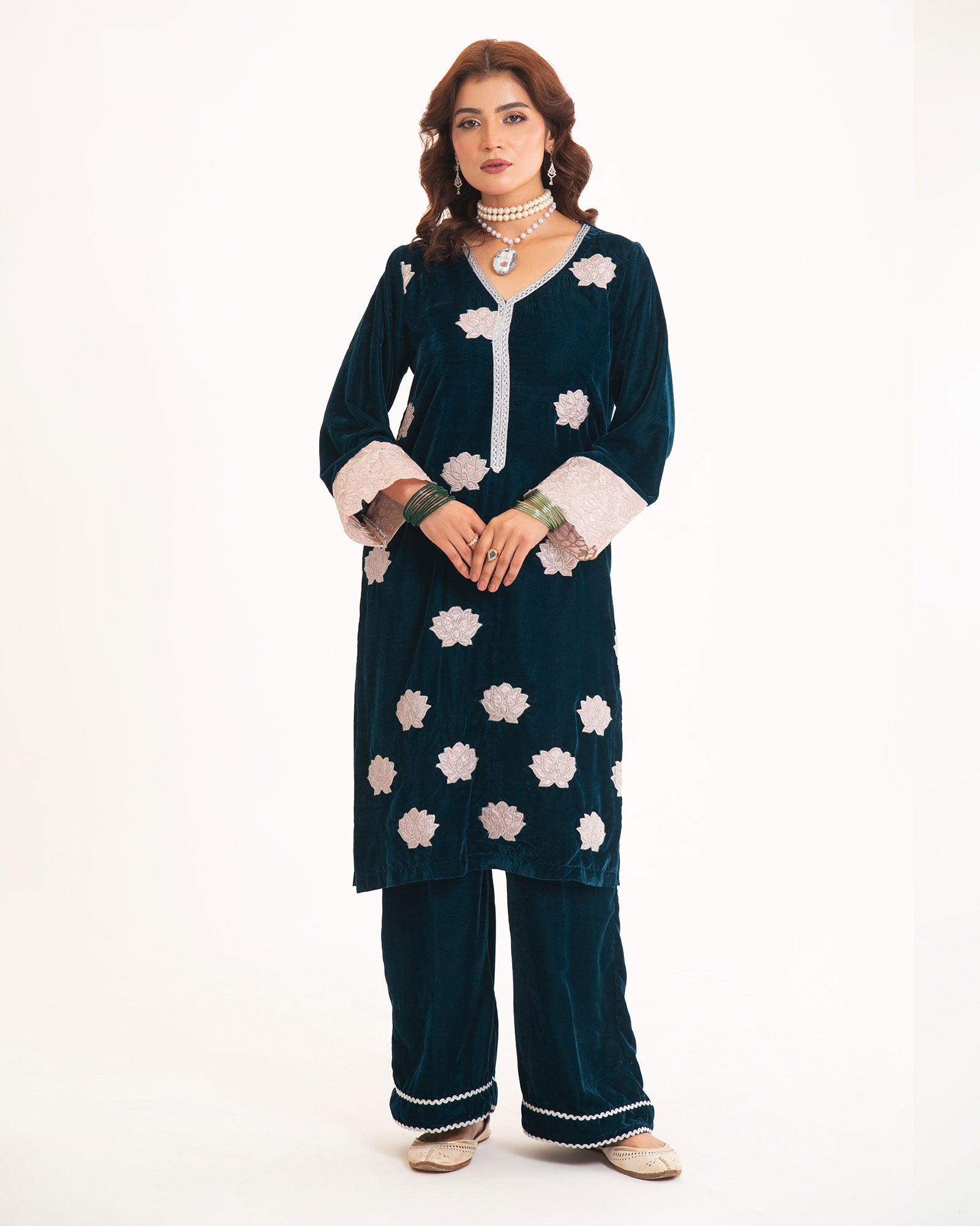 A midnight-blue velvet shirt, adorned with delicate silver tilla appliqué, defines the essence of winter luxury. Paired with a tailored trouser, this rich ensemble offers warmth, elegance, and timeless sophistication