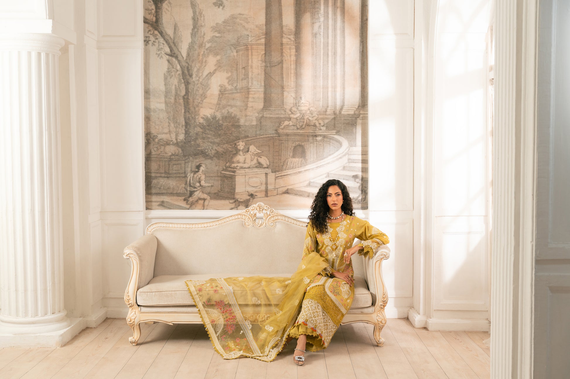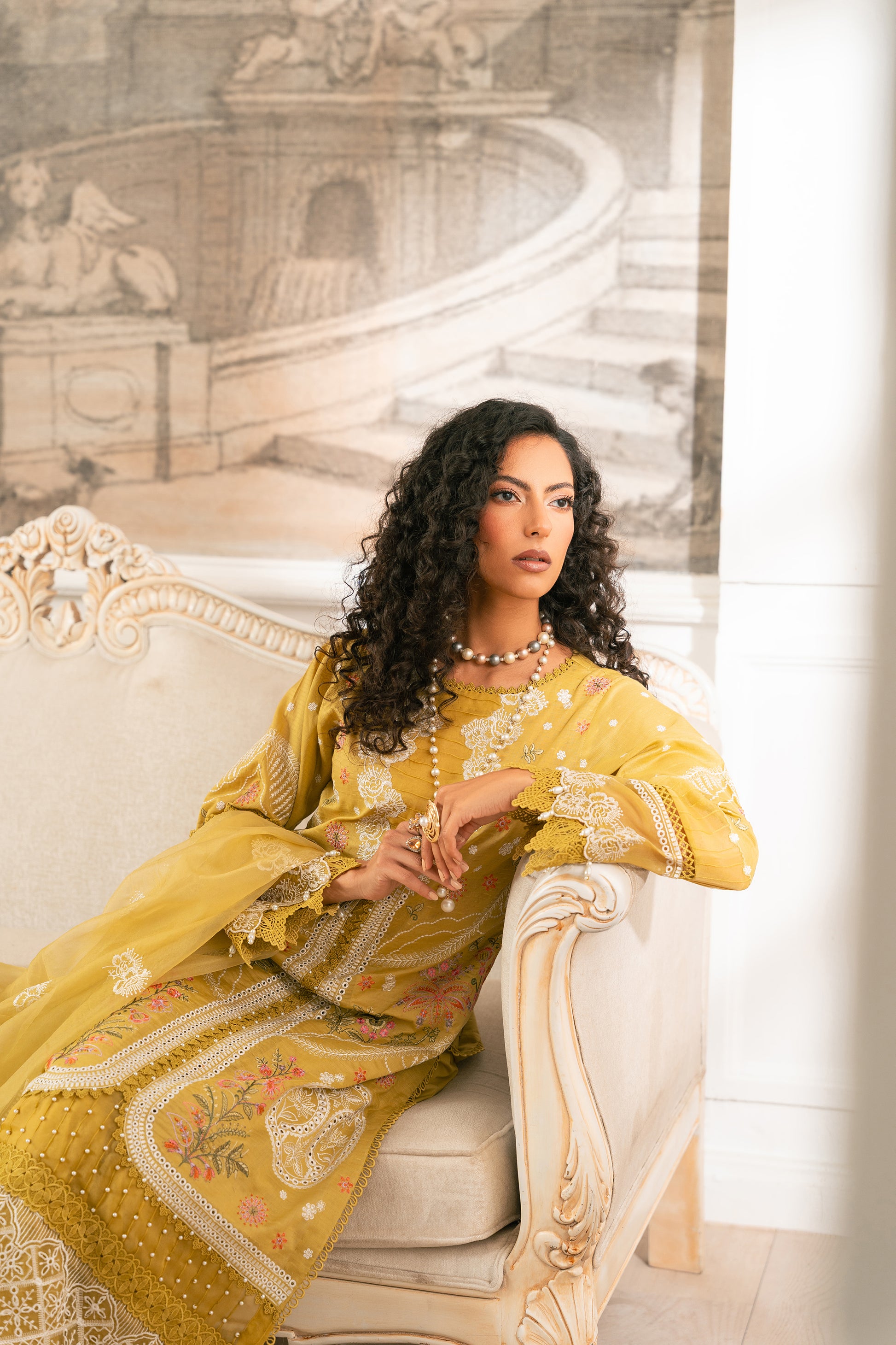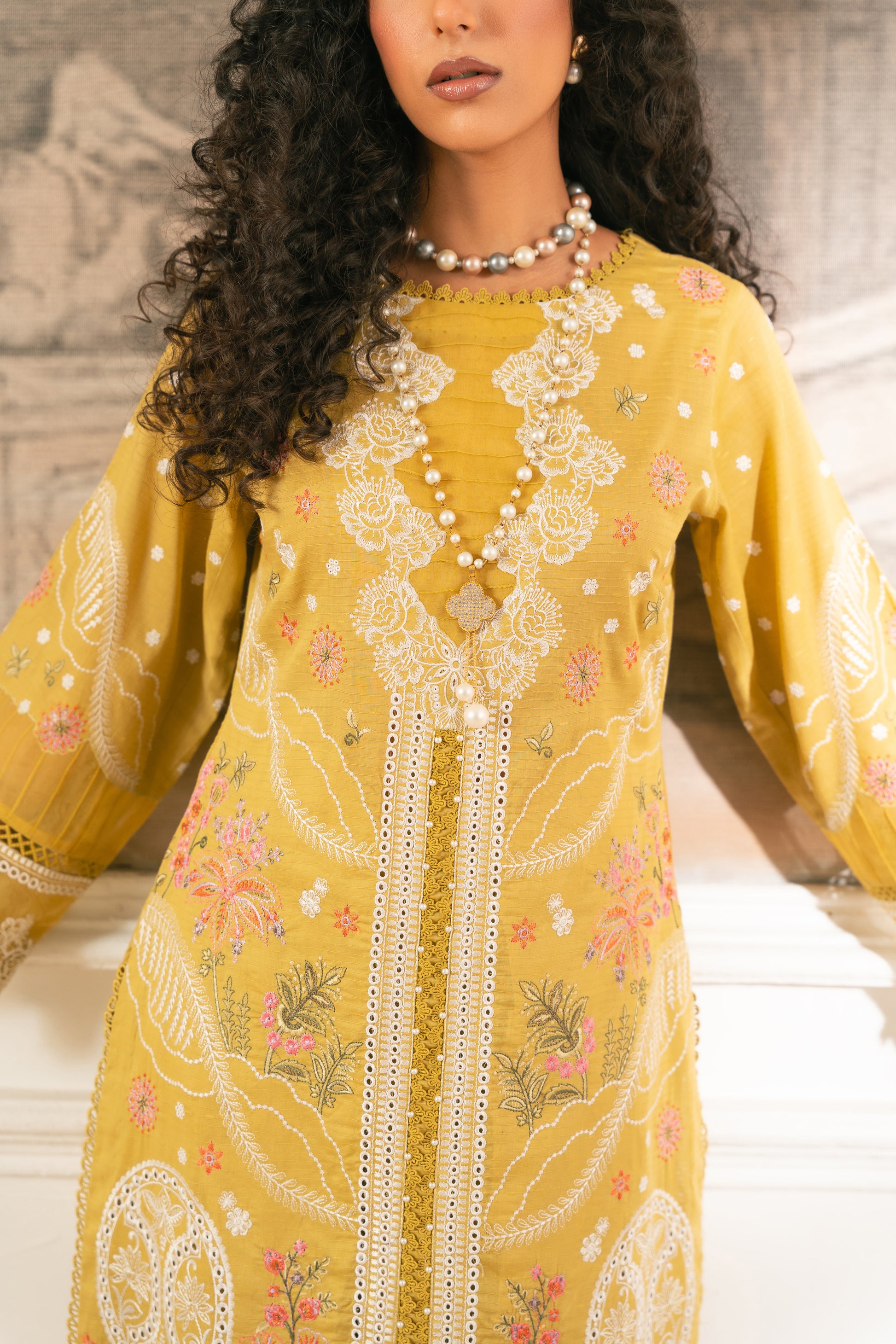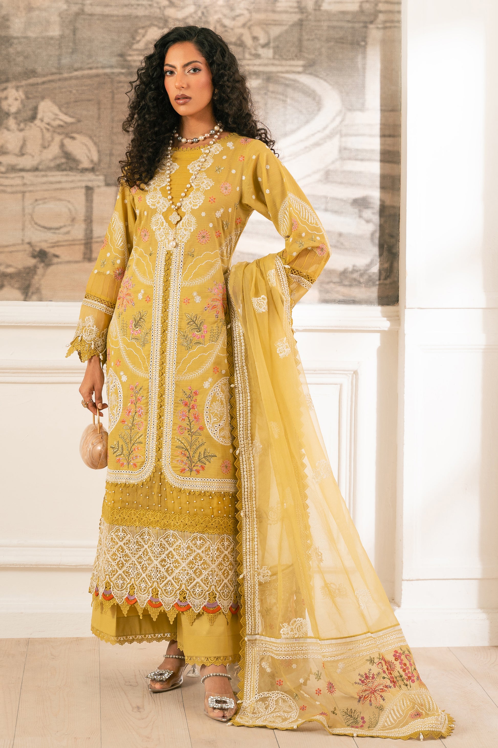 Complete your look with a beautifully crafted Schiffli-embroidered slub lawn shirt, paired with pants and a stunning pure organza dupatta. The dupatta features exquisite embroidered borders and a lavish pallu, adding a touch of elegance. This ensemble seamlessly blends traditional charm with modern sophistication, perfect for those who desire effortless style and timeless grace.