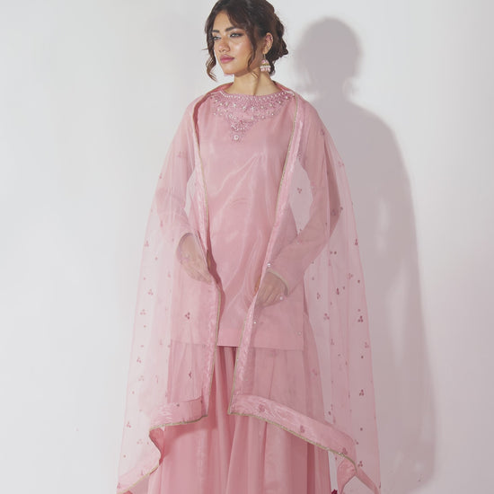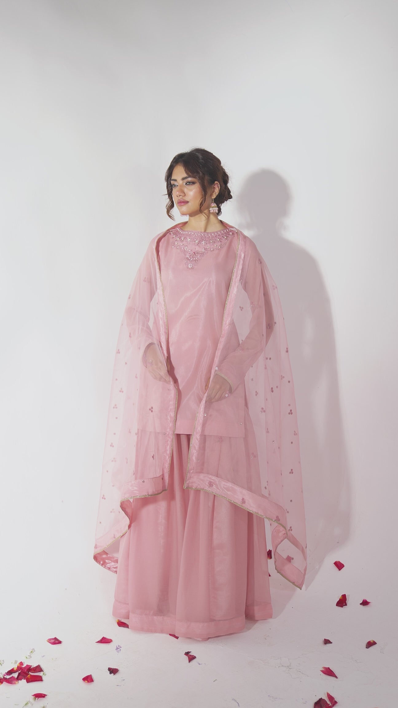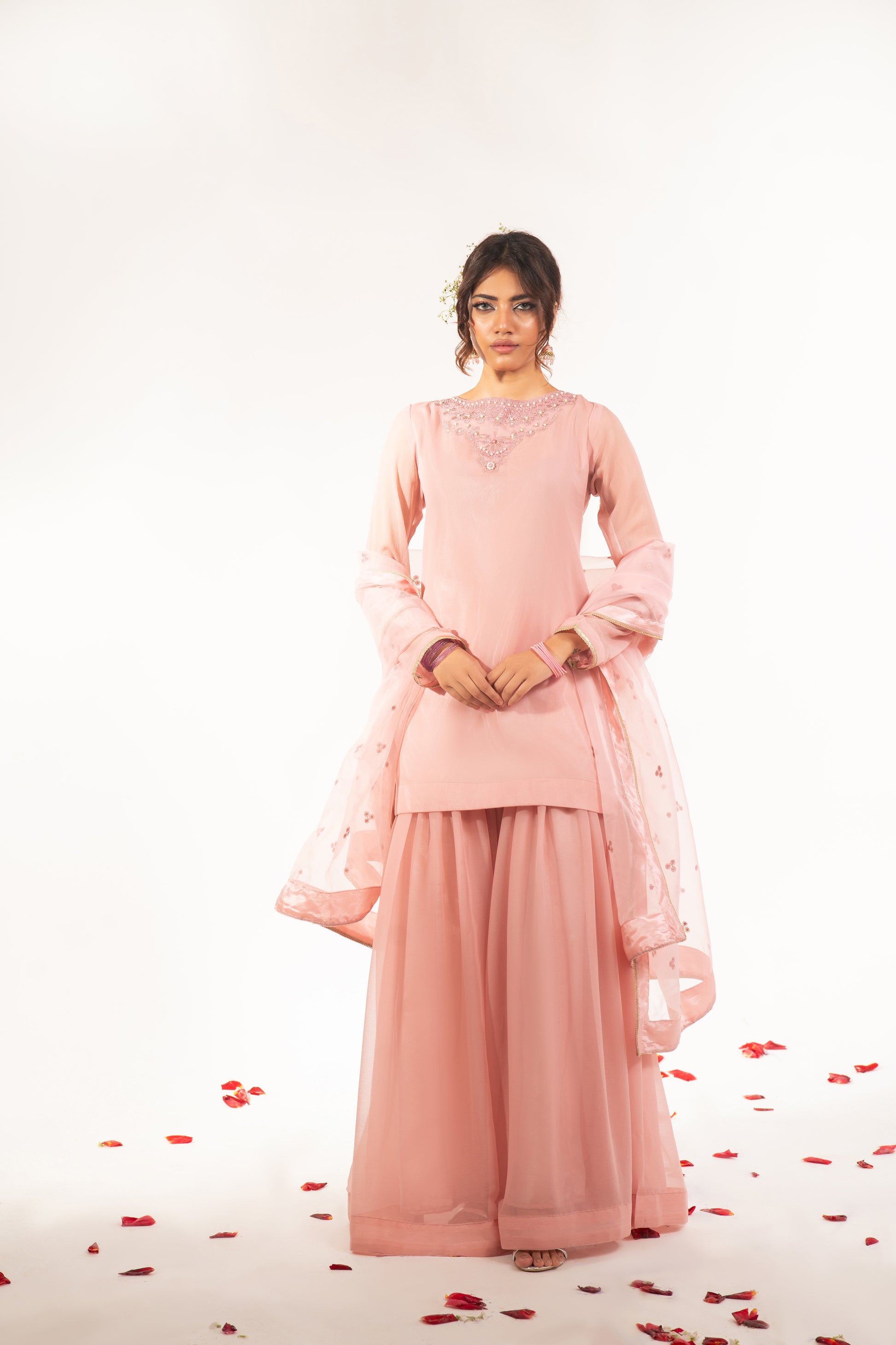 Draped in a soft rose pink hue, this trendy sharara set exudes effortless elegance and festive charm. The delicately embroidered neckline adds a refined statement, perfectly balanced with the flowy silhouette. Paired with an embroidered dupatta, this ensemble is ideal for graceful festive and get-together looks.