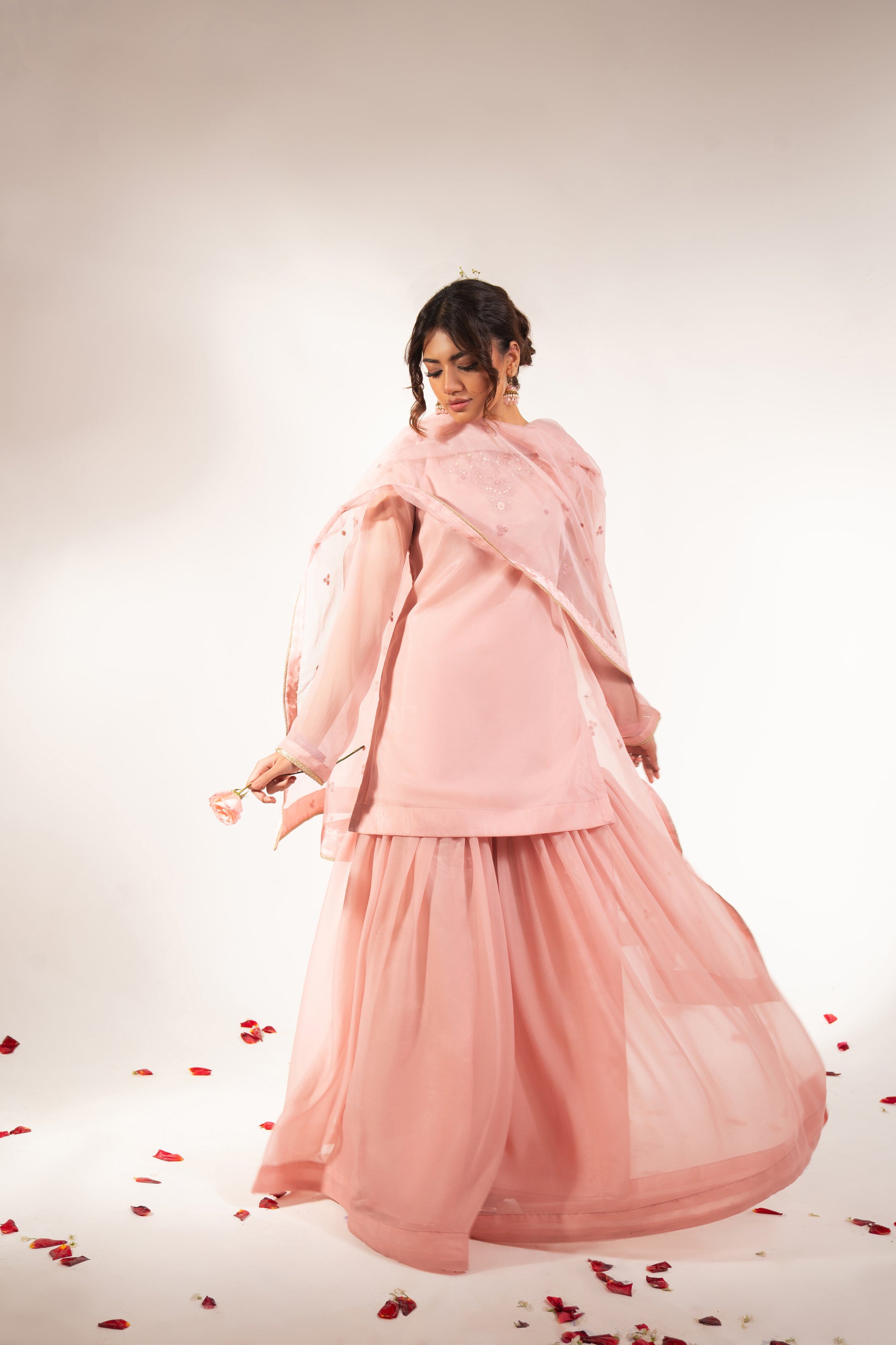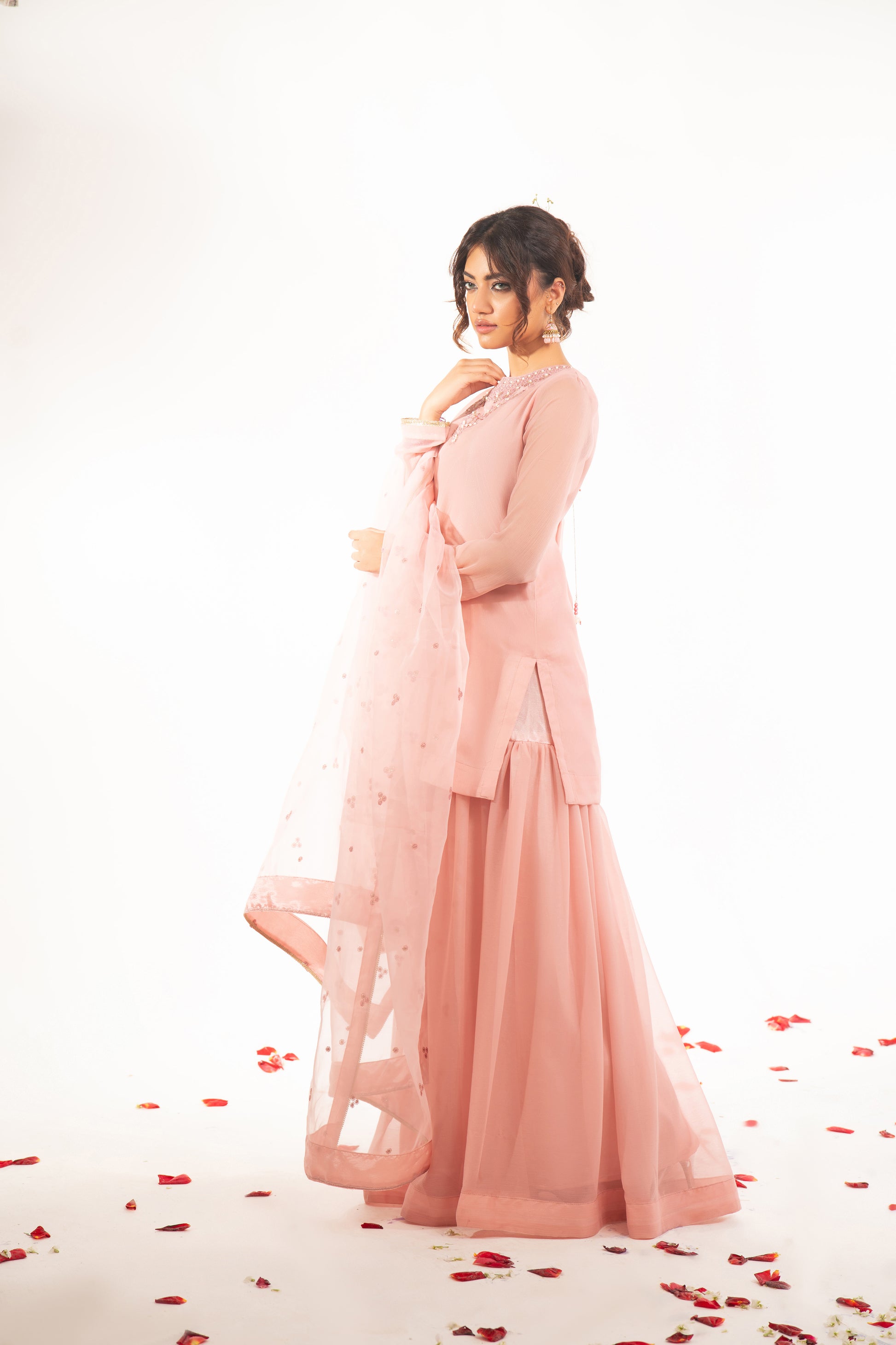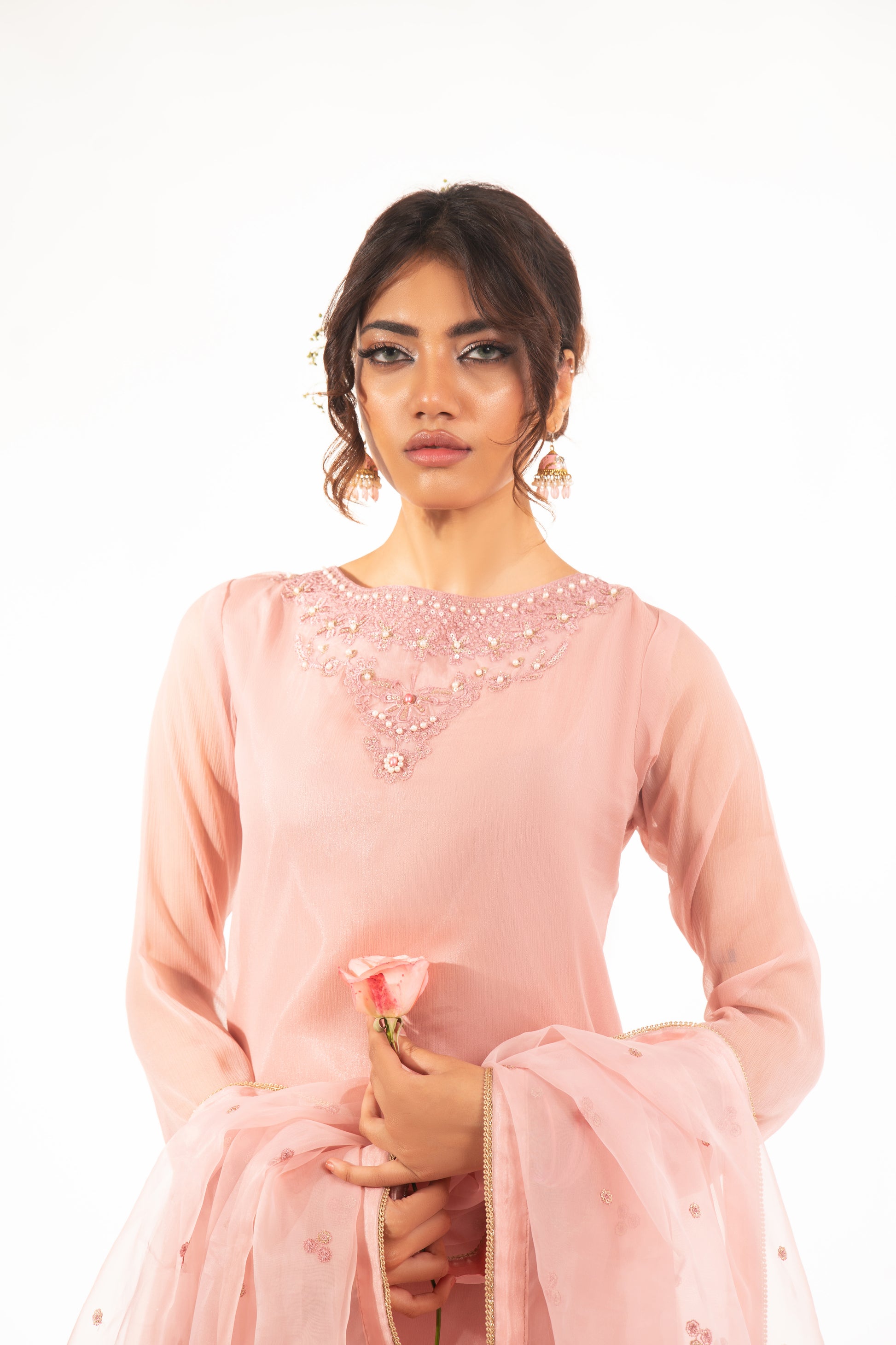 Draped in a soft rose pink hue, this trendy sharara set exudes effortless elegance and festive charm. The delicately embroidered neckline adds a refined statement, perfectly balanced with the flowy silhouette. Paired with an embroidered dupatta, this ensemble is ideal for graceful festive and get-together looks.