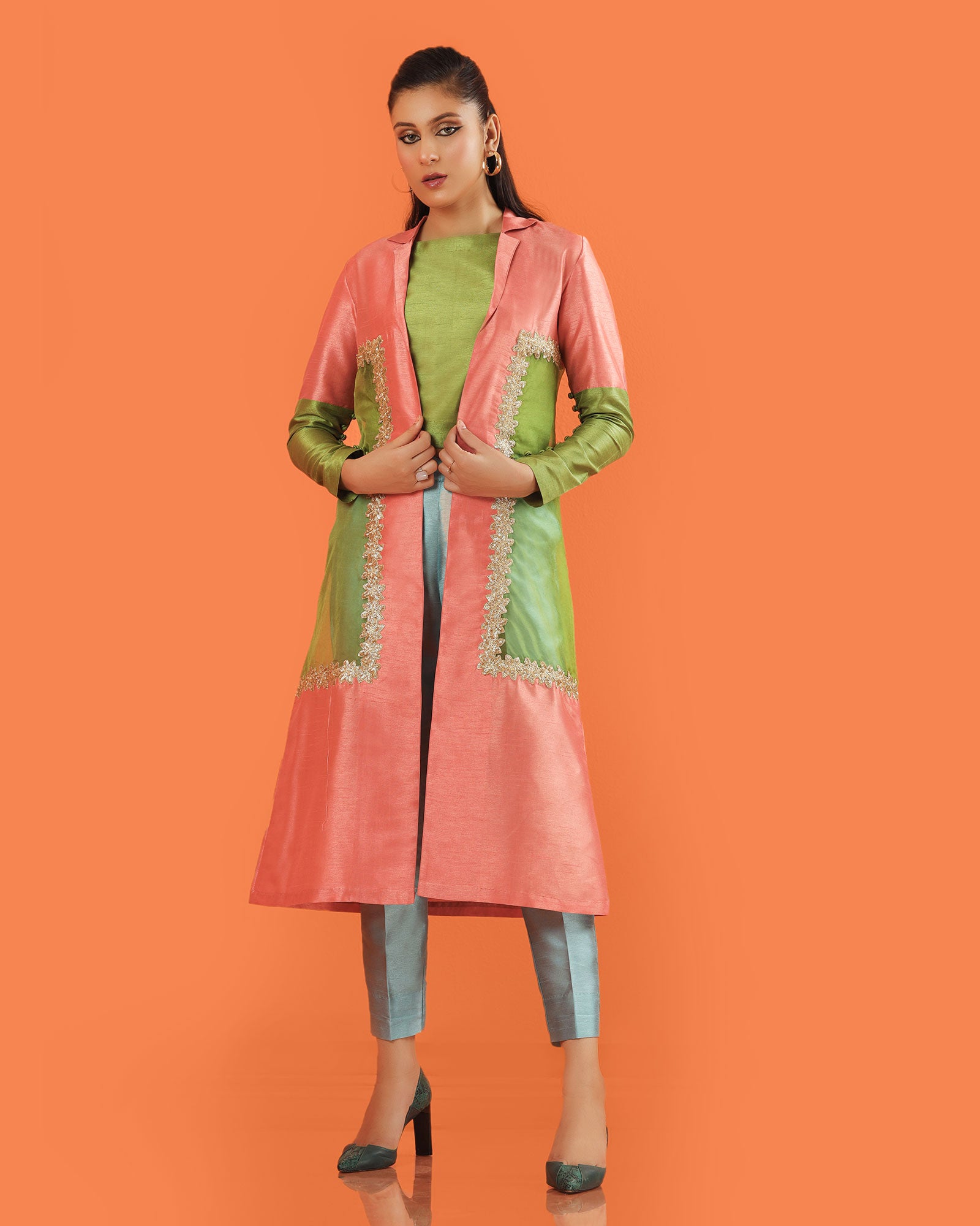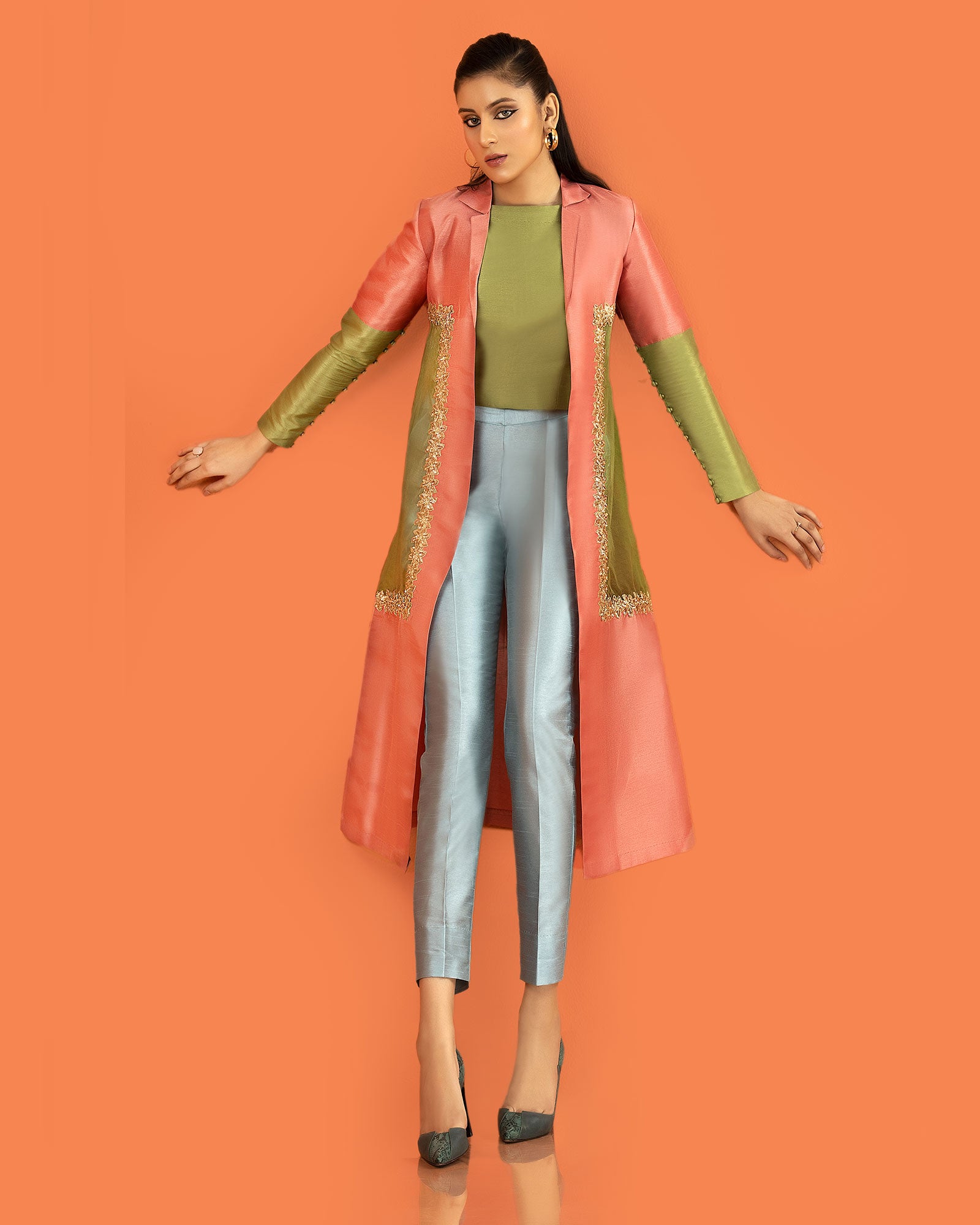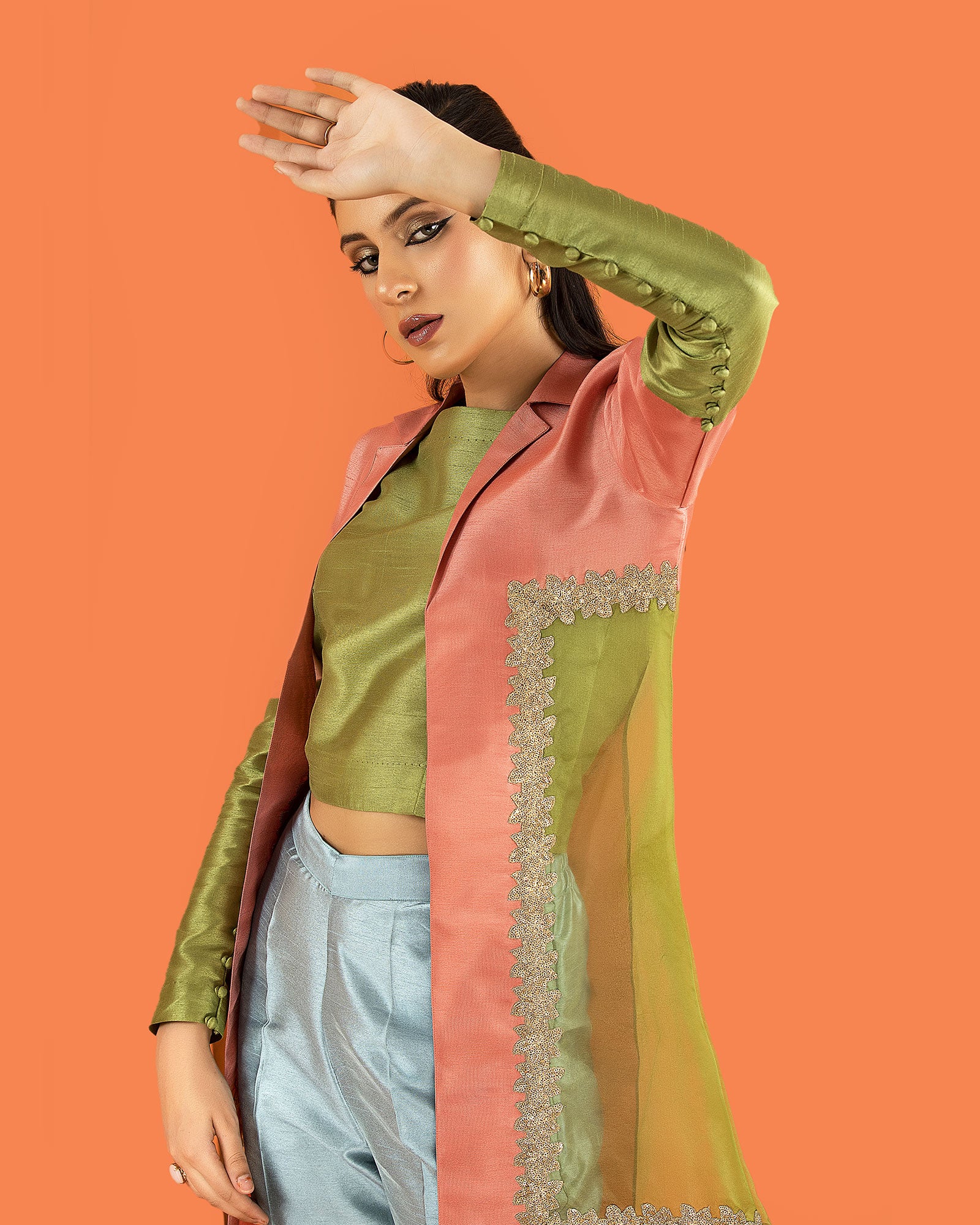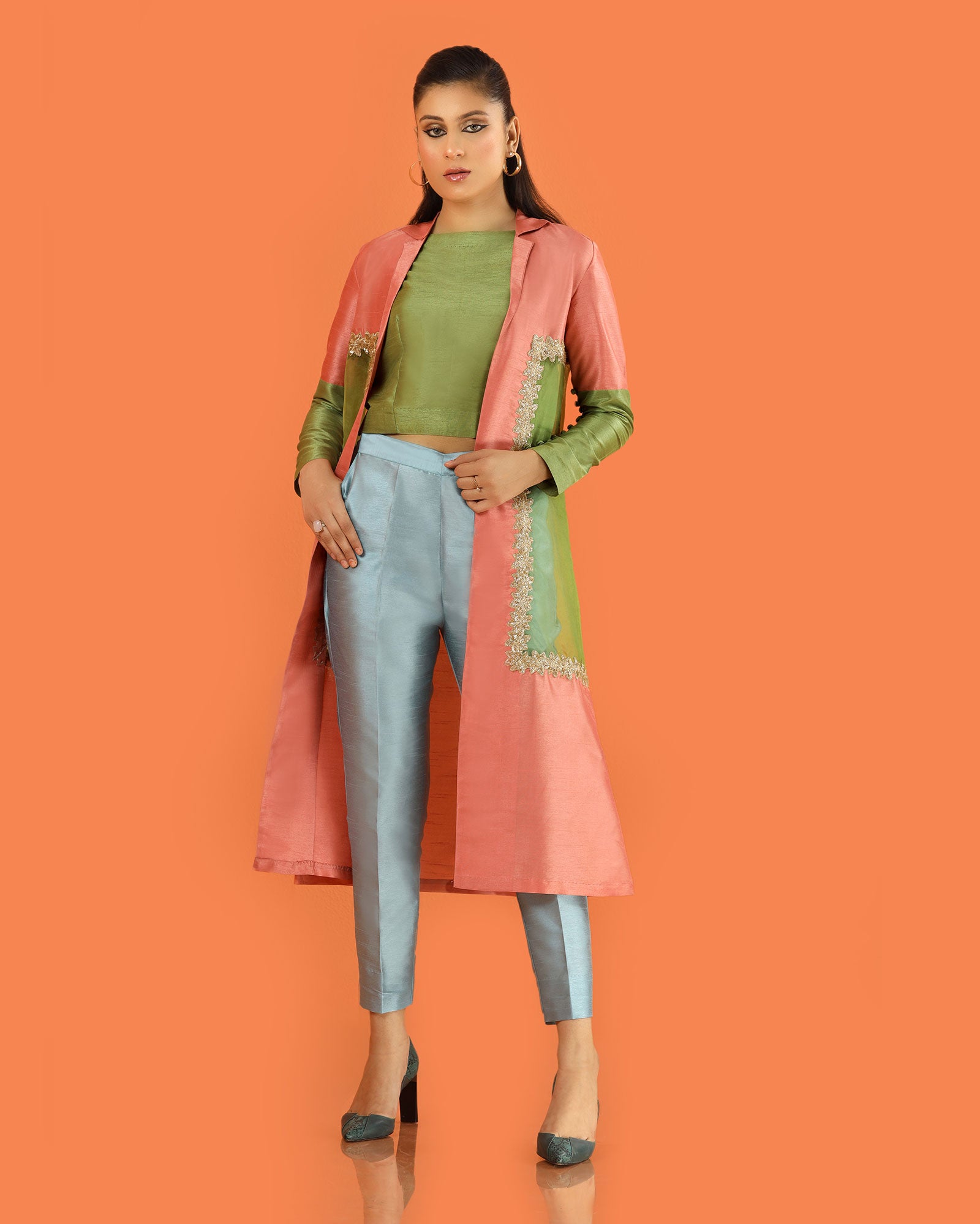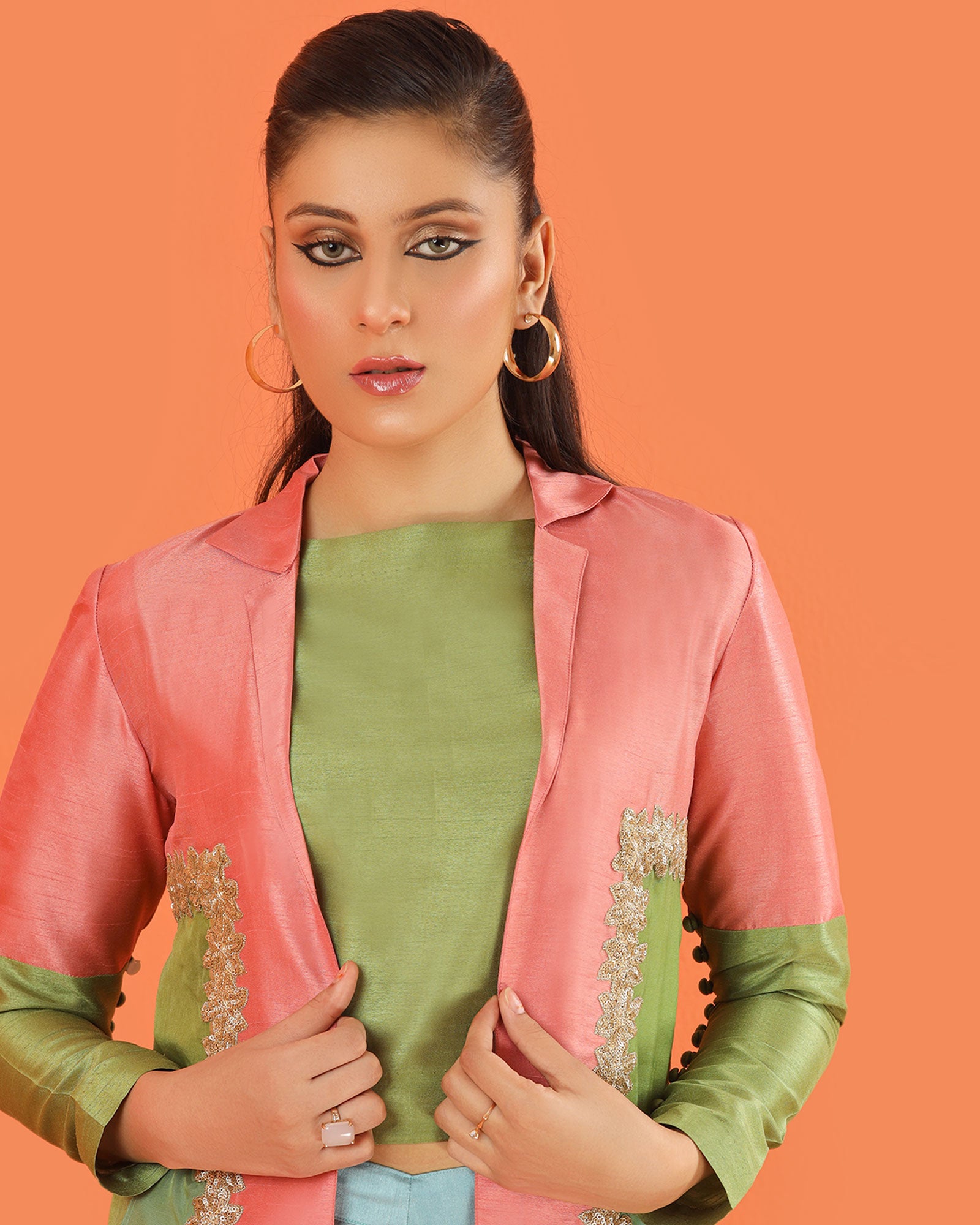 This pastel pink color comes with embellishment details on side pannels, along with sleeves come from middle to the wrists with loops. Paired with cigrette pant and tank top completing the chic look.